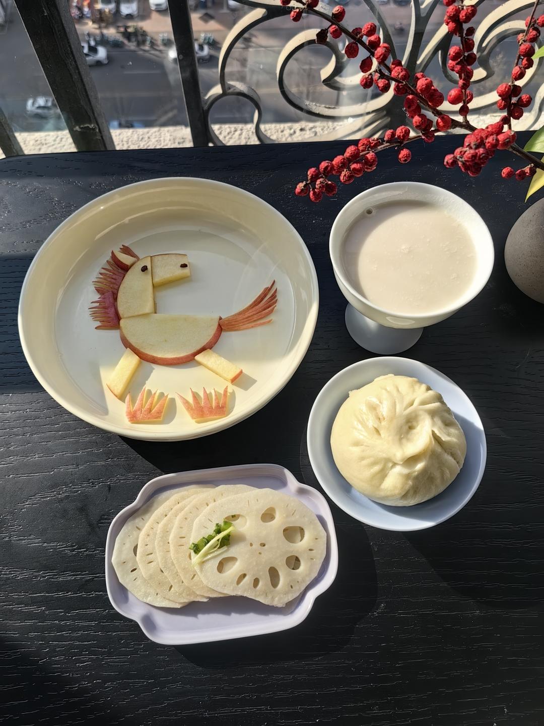 牛奶🥛+肉包子🥟+拌莲菜🥗+水果拼盘~苹果小马