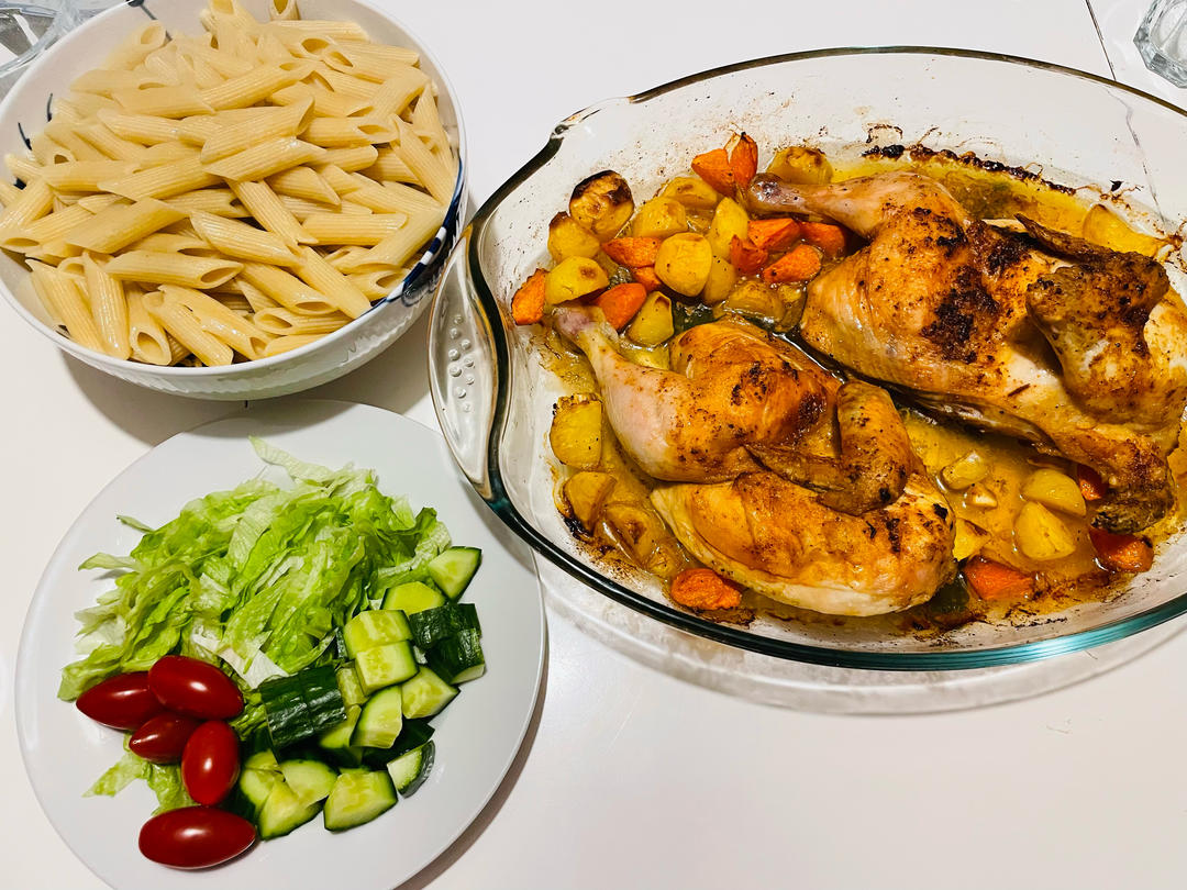 工作日晚餐,儿子的同学们来家里玩,所以又有烤鸡🐓,意大利面,又有自己做的pizza🍕😋。