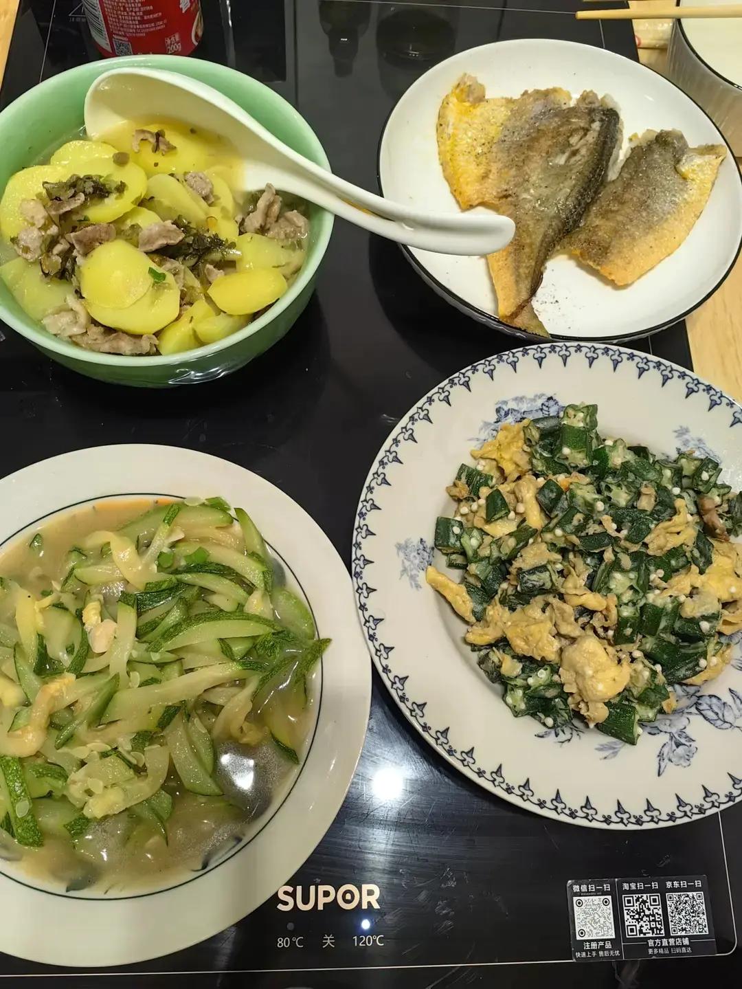还是自己做的饭最合胃口,雪菜肉丝土豆汤,香煎黄鱼,清炒南瓜,秋葵煎蛋