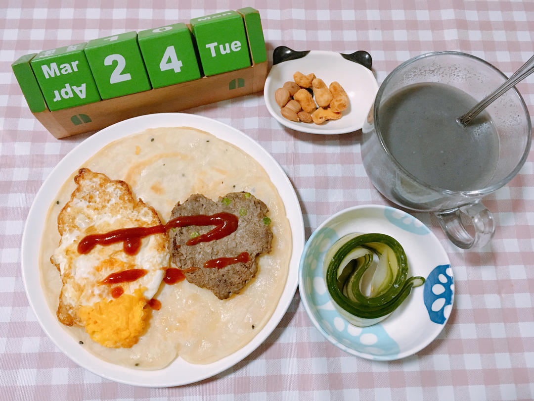 G9S2.W4Day2.手抓饼加豌豆牛肉饼并煎蛋🍳搭雪碧黄瓜🥒配黑芝麻糊佐蟹黄腰果并小...