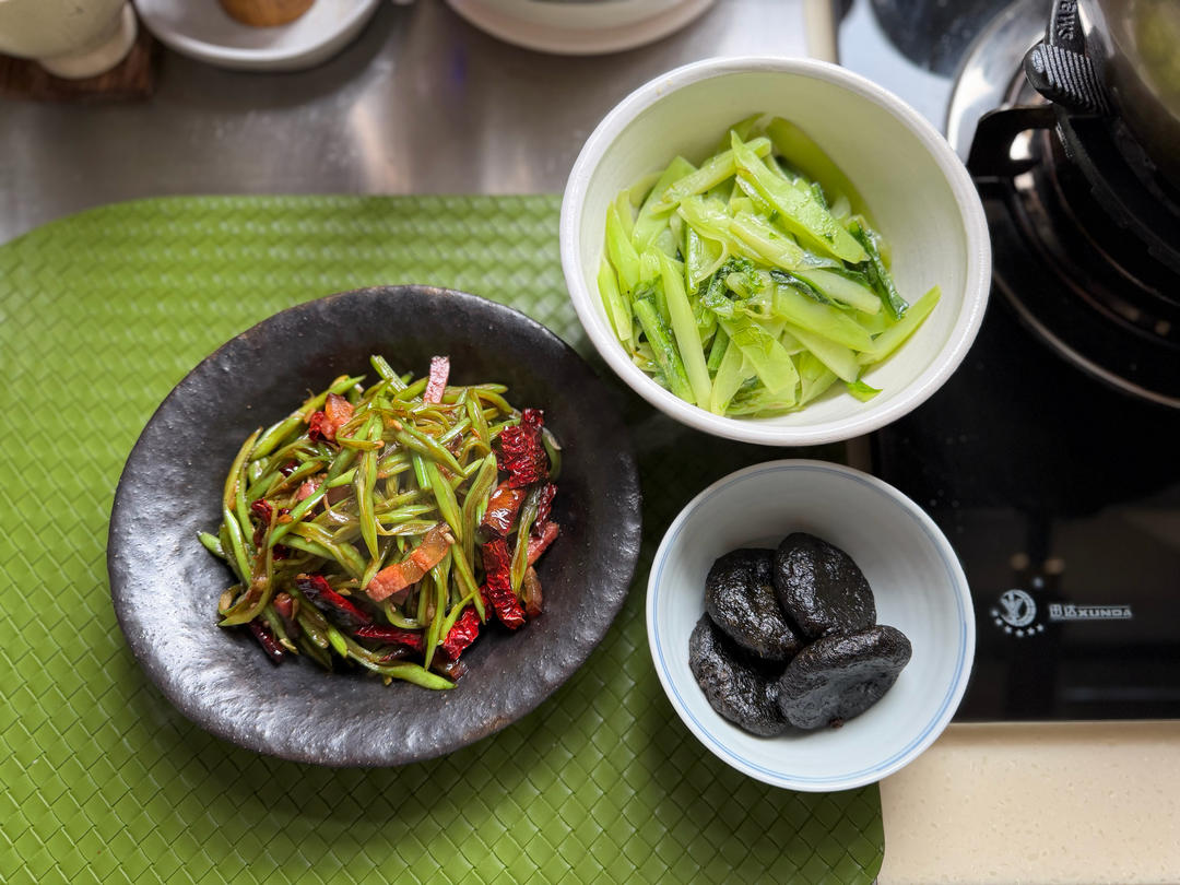 🍚宽扁四季豆,一部分炒腊肉,一部分橄榄菜素炒,莴笋尖,蚂蚁上树,平菇。