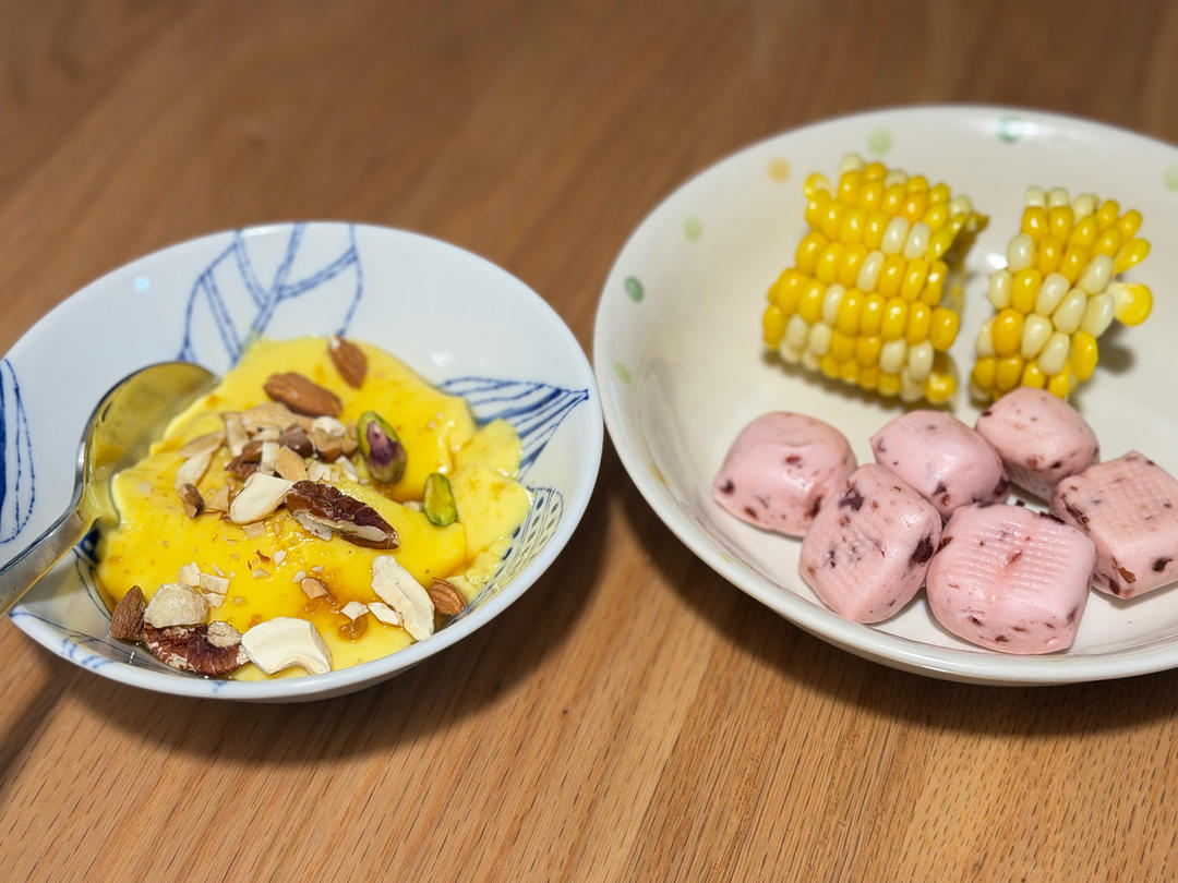 小朋友营养早餐,水蒸蛋、玉米、草莓小馒头、坚果、枇杷
