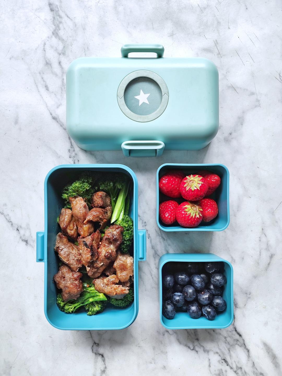 今日便当:炒西兰苔+烤羊肉串+草莓+蓝莓~~