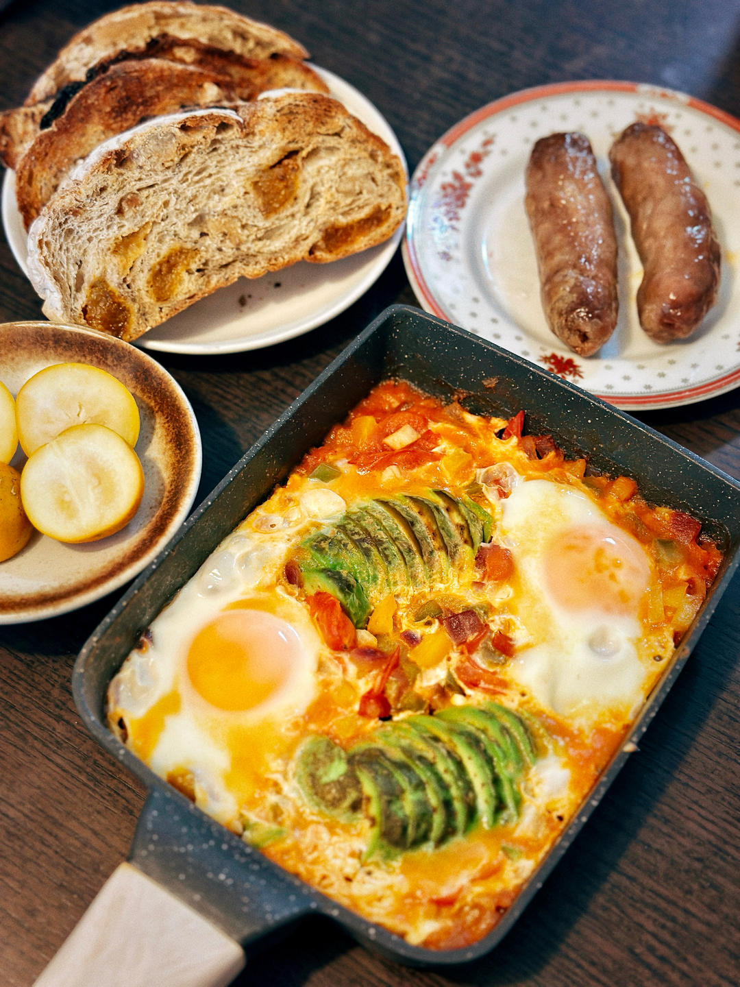 今天阳光很好☀️Brunch:牛油果北非蛋➕梅子欧包➕烤肠~