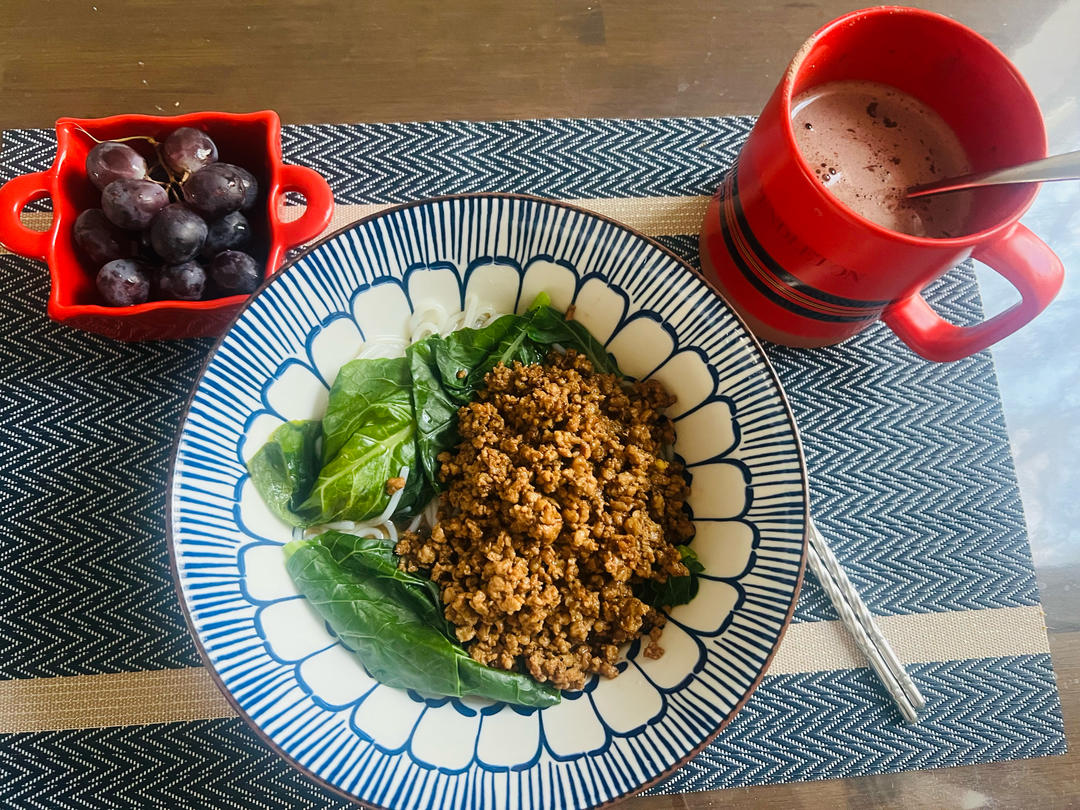 肉末米粉;午餐:红烧排骨;晚餐:烧鸭。