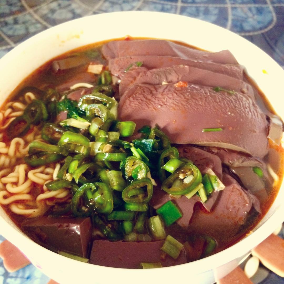 一盒华英鸭血➕一盒泡面➕一根用酱油泡过的青椒➕葱和香菜=人间美味