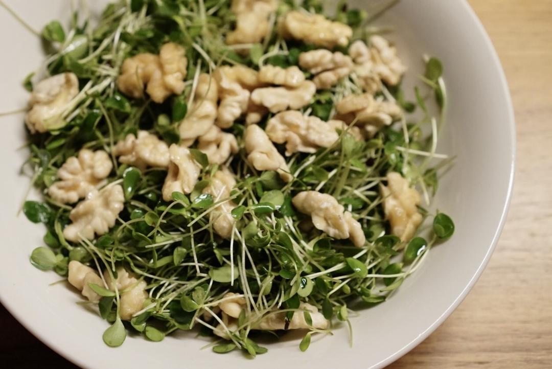 新核桃仁+香椿苗,只调现磨海盐和芝麻香油,一起入口:辣、甜、咸在口中交融,有舒服的辣、浅薄的咸,继而伴随着明显而迅速的甜...
