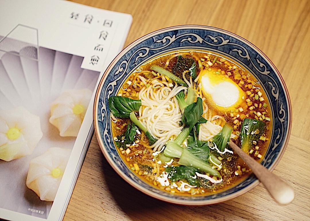 当小清新遇到重口味。今晚的小面放了一大勺萝卜干辣椒油,还有一枚溏心水波蛋!新书颜值太高,做道具不二。