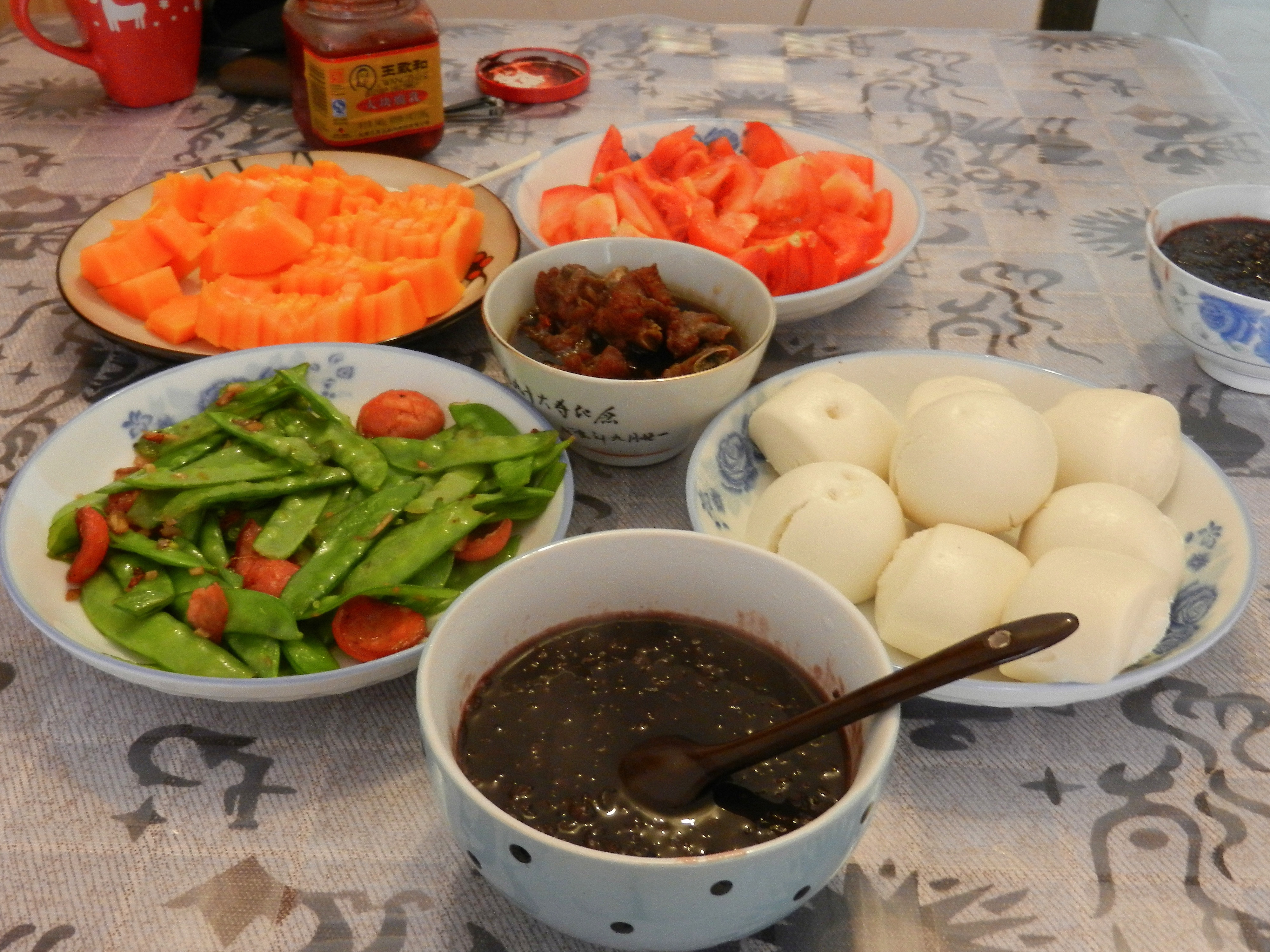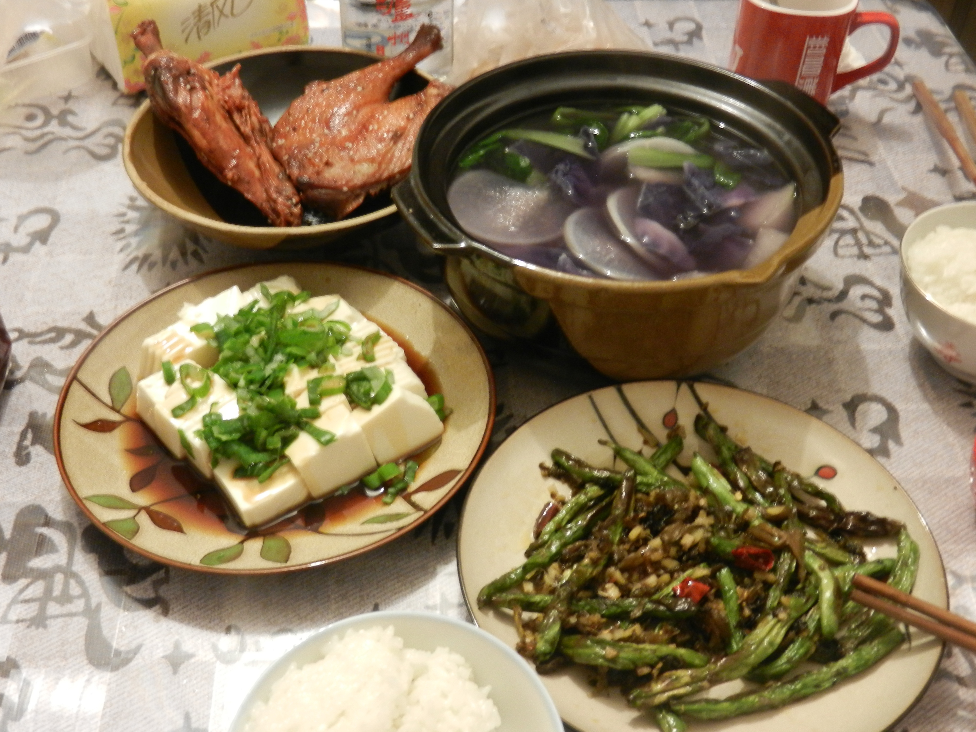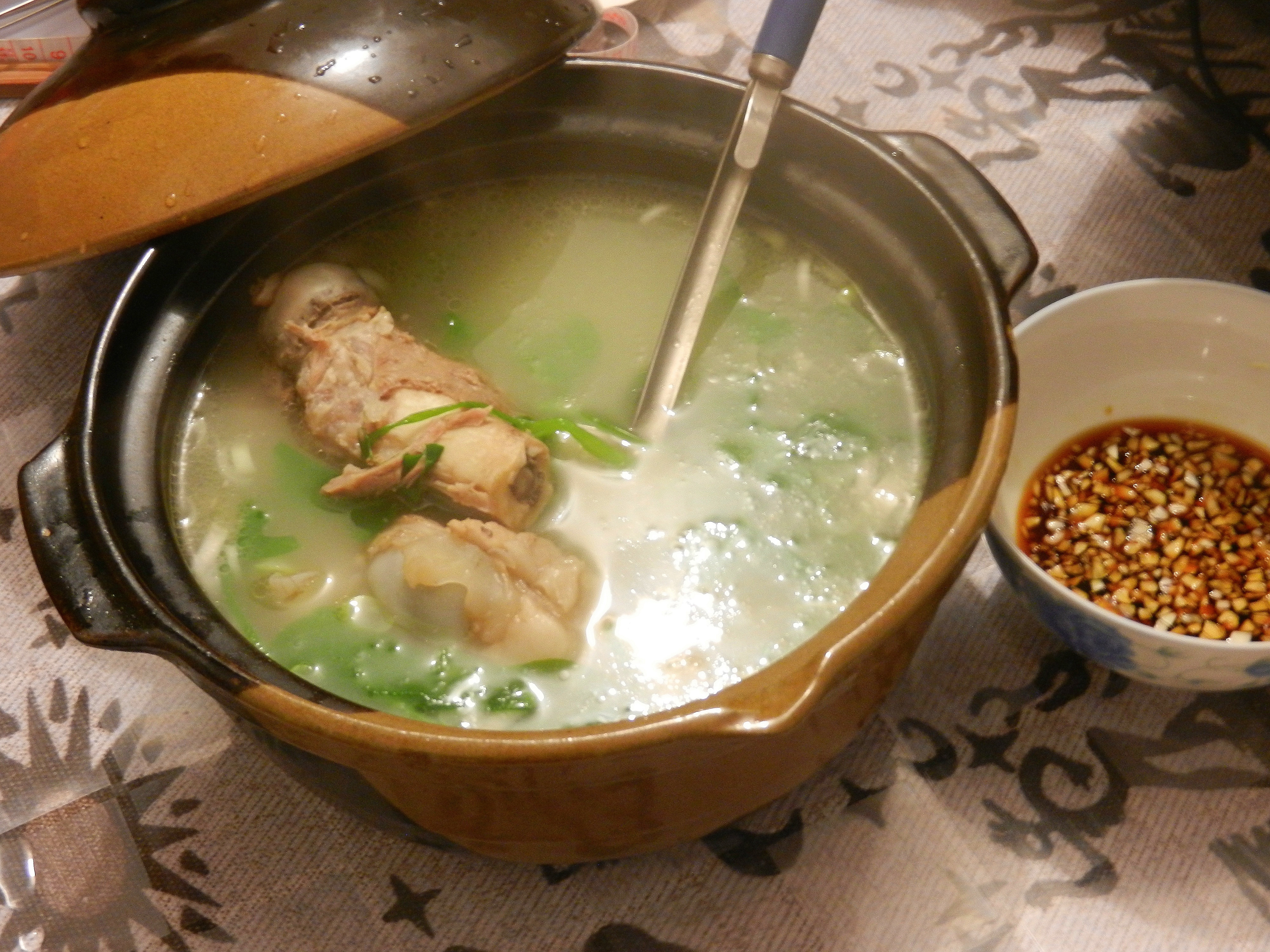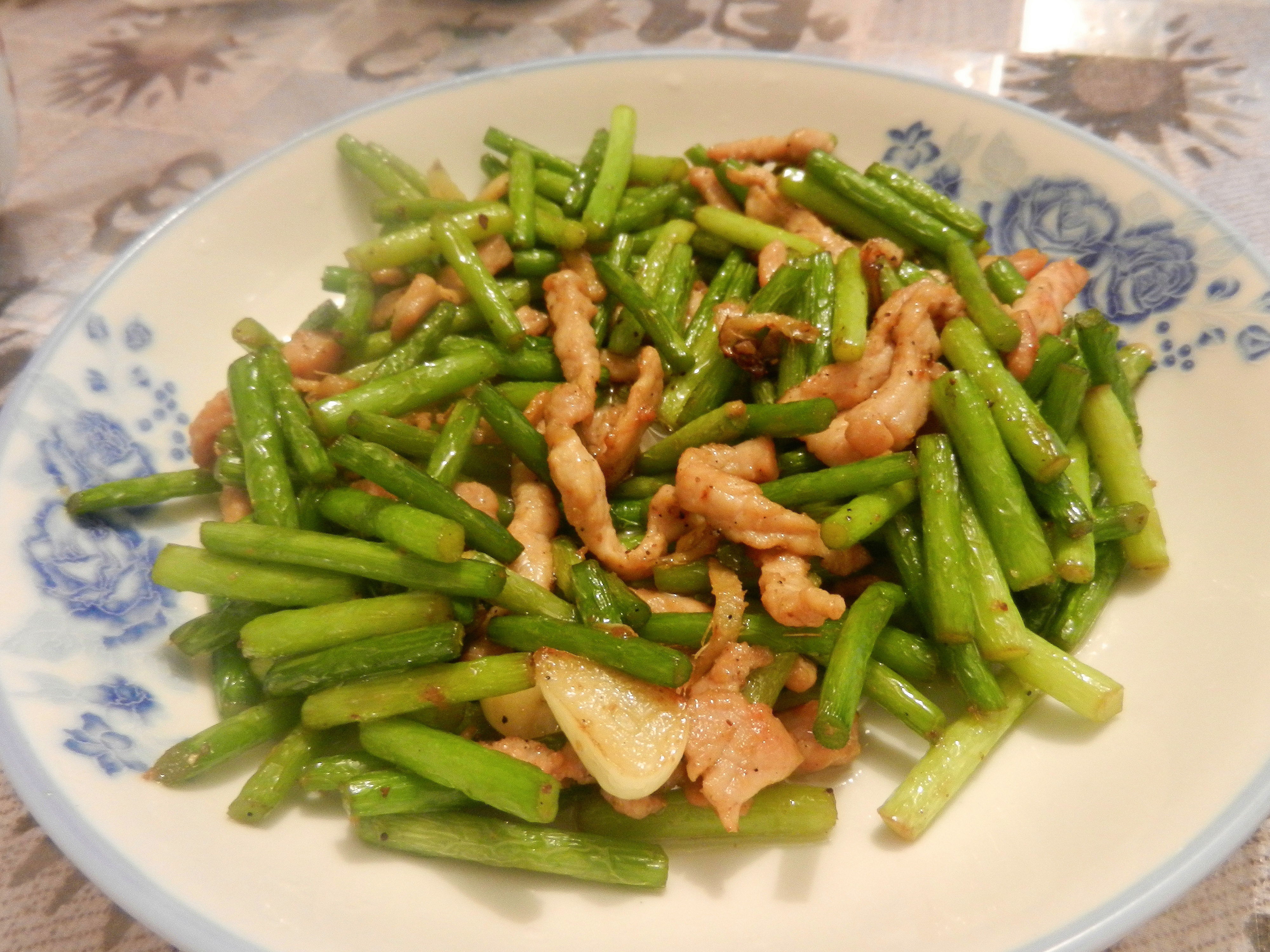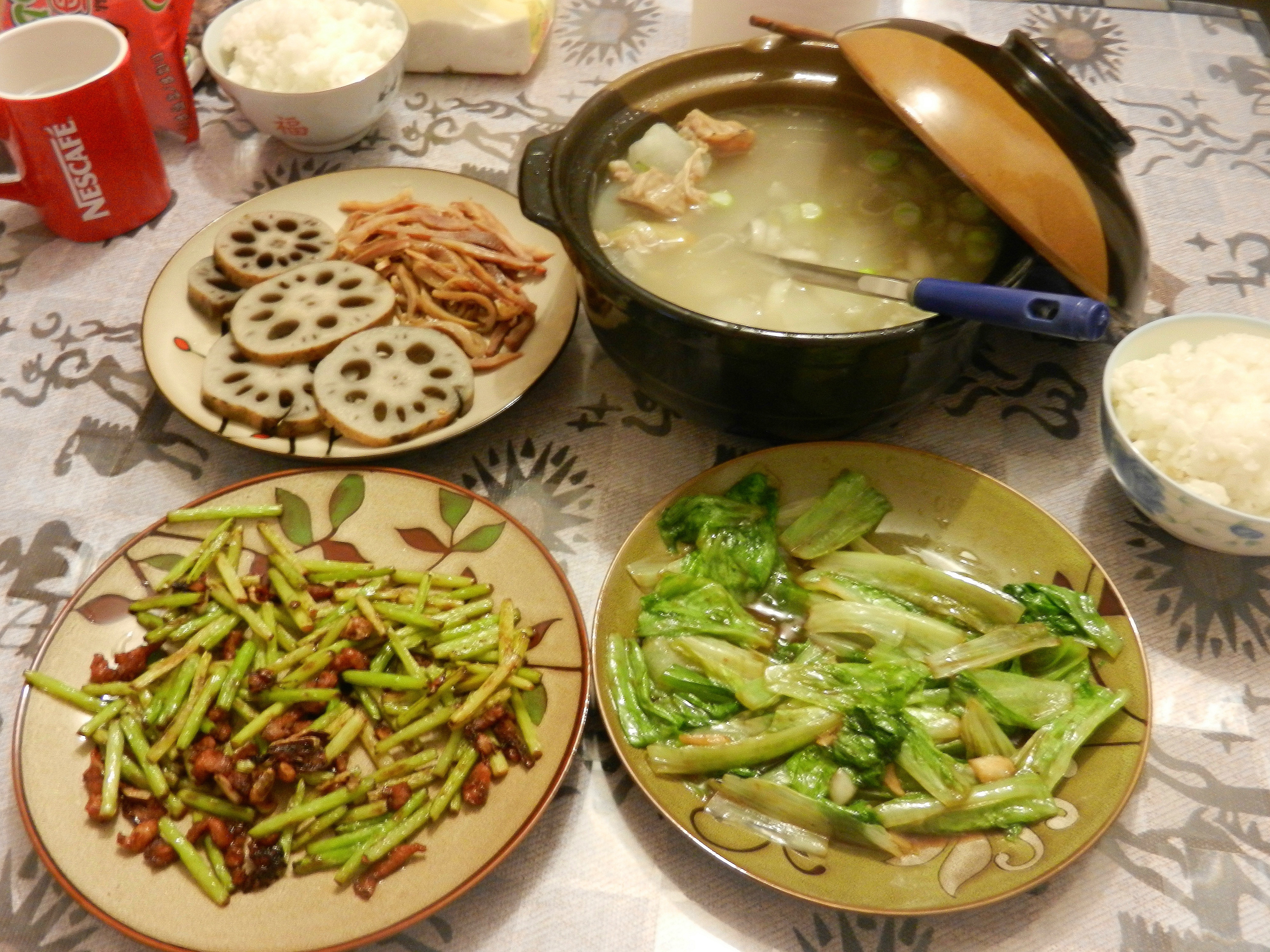 #李老湿出品# 蒜薹肉丝+蚝油生菜+卤菜+萝卜排骨汤。。排骨汤炖了两小时,脆骨都酥了,李老湿好开心,喝了好多汤,好吃~~...