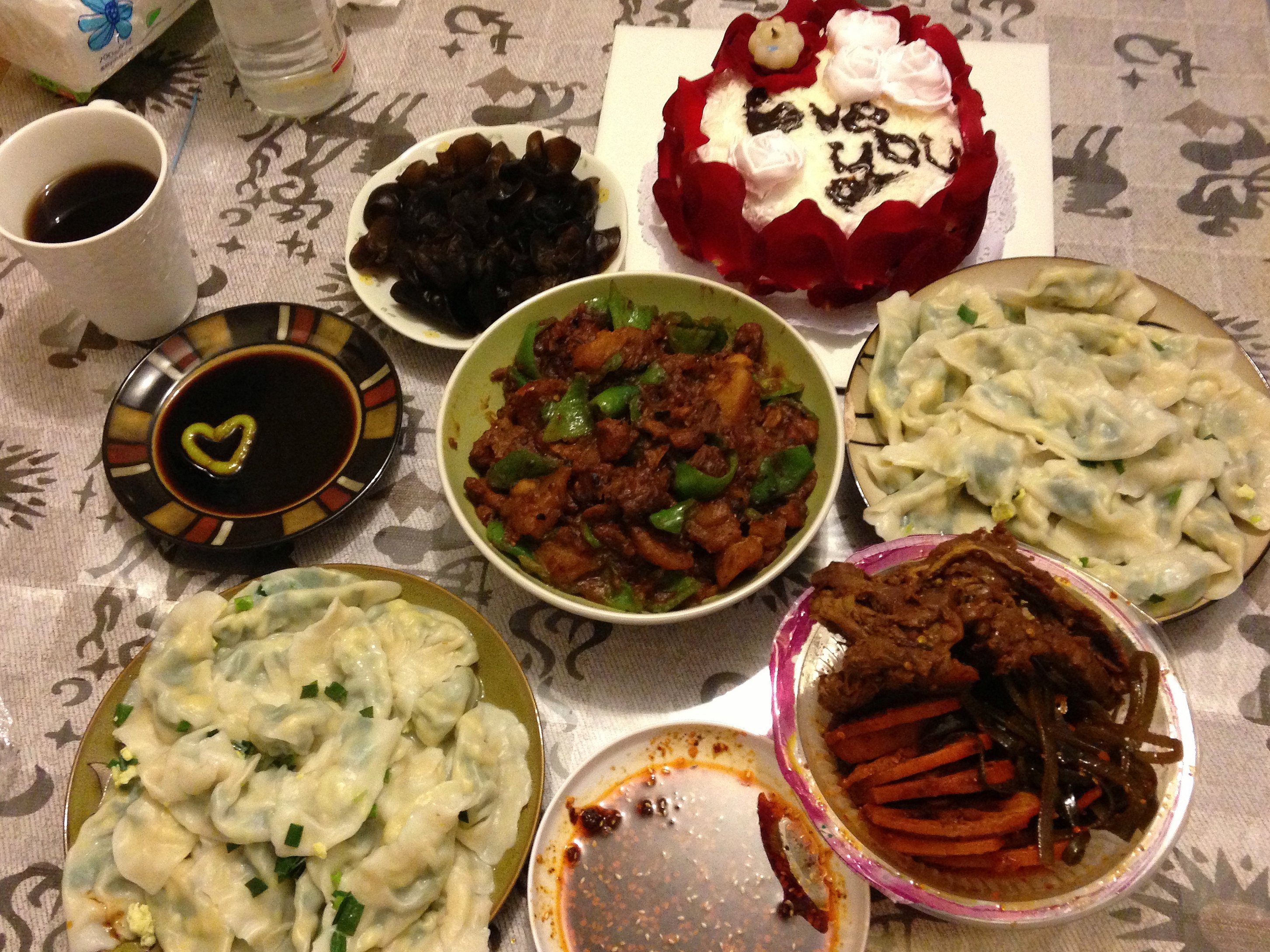 #李老湿出品# 饺子+可乐烧鸡+芥末蘸木耳+纪念日蛋糕。吃撑了……