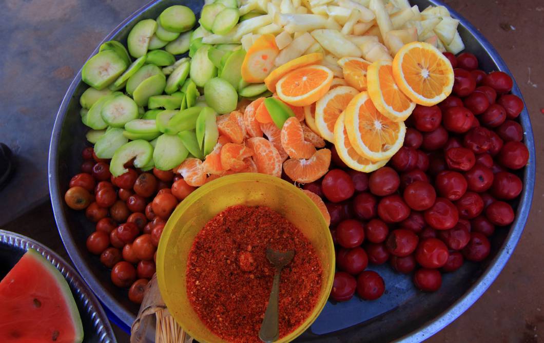泰国有“水果王国”的美誉,街头随处可见的水果摊上,芒果、菠萝、木瓜各种各样的热带水果绝对让你目不暇接,你可以买上几袋,跟着当地人一起撒上辣椒粉拌一拌(什么?辣椒粉?!对,你没有看错!)。可见泰国人民对辣椒的热爱真的是非常非常的疯狂!