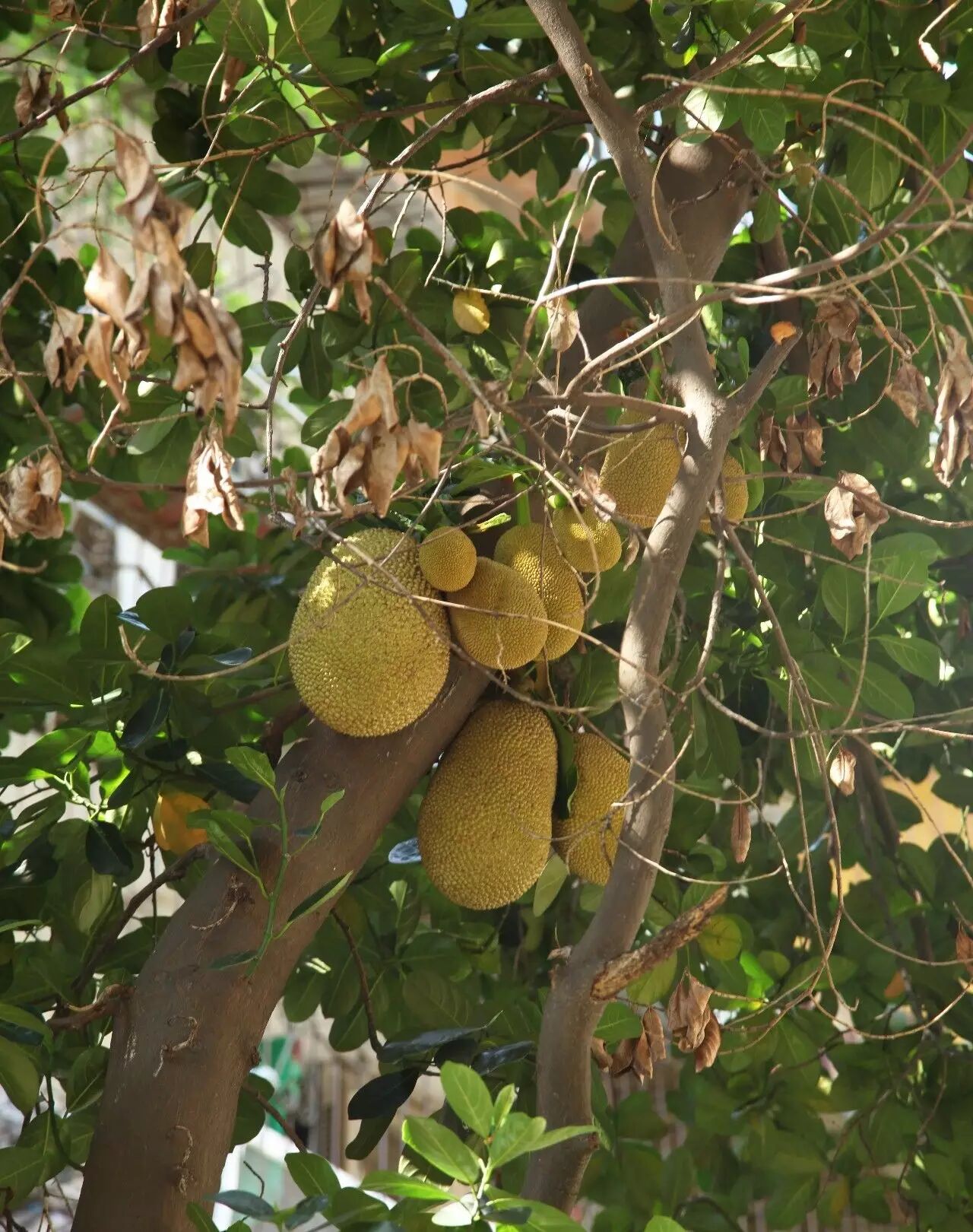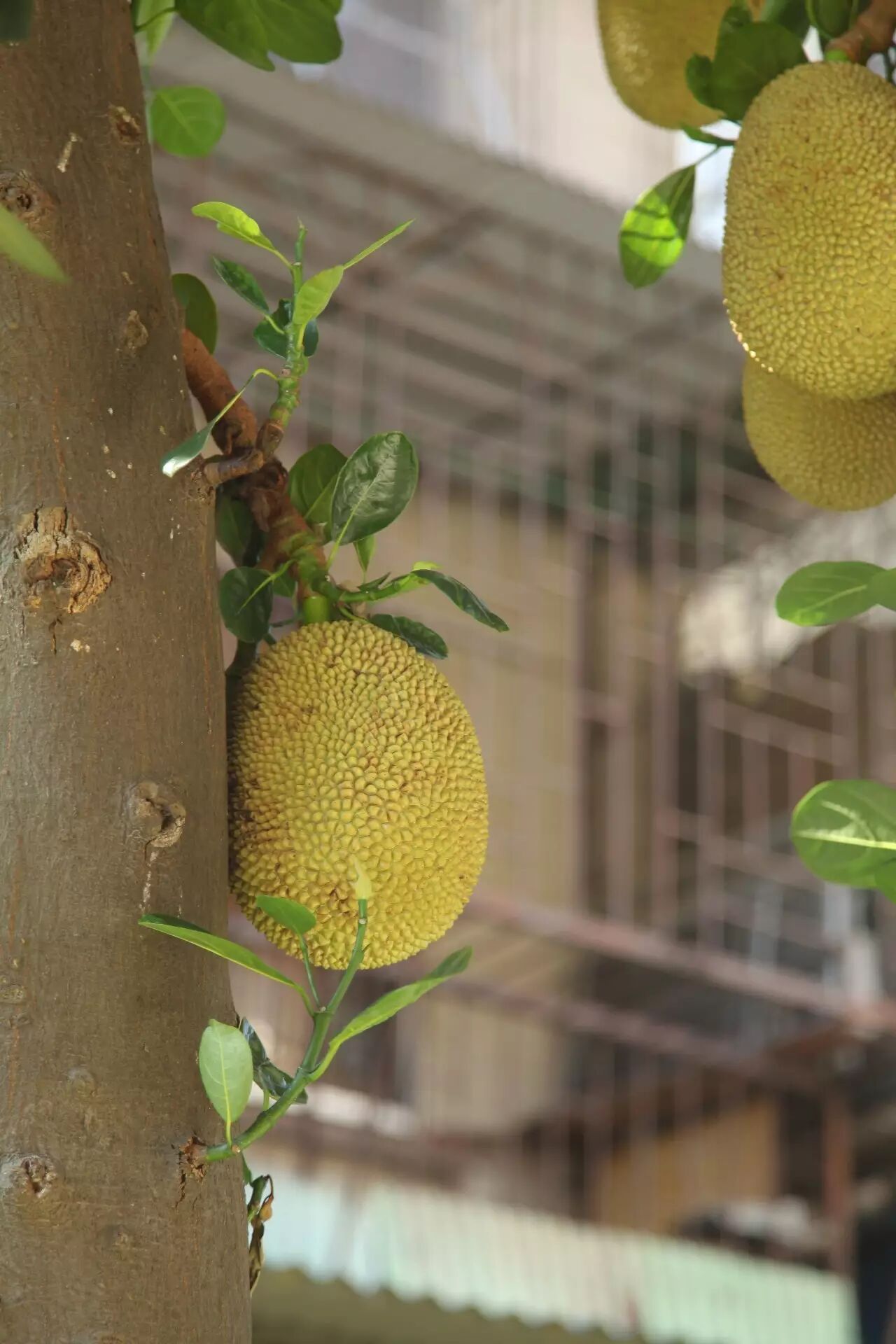 ▲湖滨三里居民楼前的菠萝蜜,已逐渐澄黄肥满