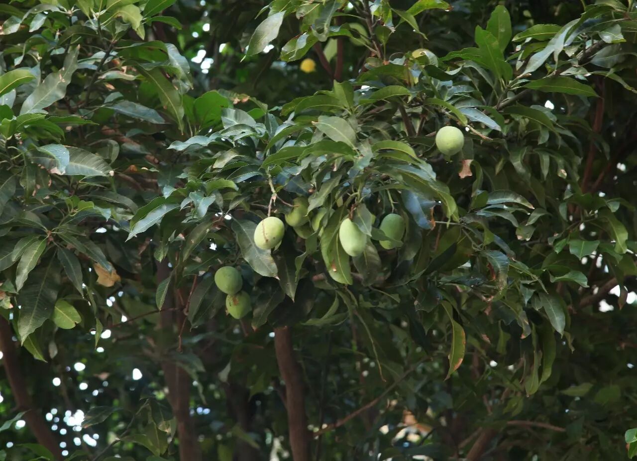 自六月起,芒果就开始露头了。芒果树叶片墨绿,微微波纹蜷曲,冠丛中伸出几支细如签棍的枝条,上头坠着一两只小小的青色“水滴”,那就是芒果了。