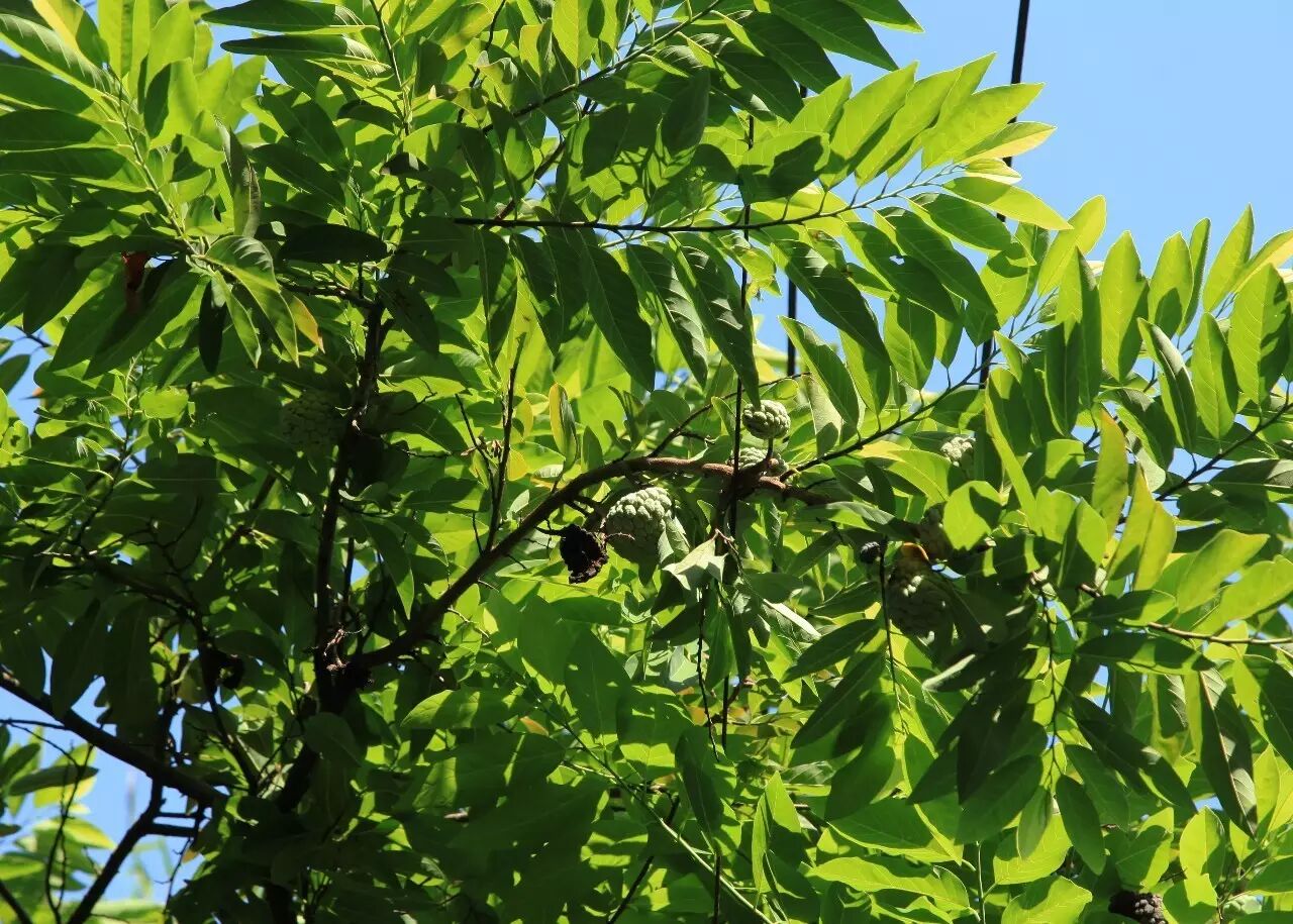 八月再见,翠绿的叶片中隐隐透出果实的影子——竟也是如叶片般绿色的释迦果!果实高悬于梢,因其外皮形似荔枝,故又称为番荔枝。释迦果皮薄肉嫩,具有甜甜的沙质口感。