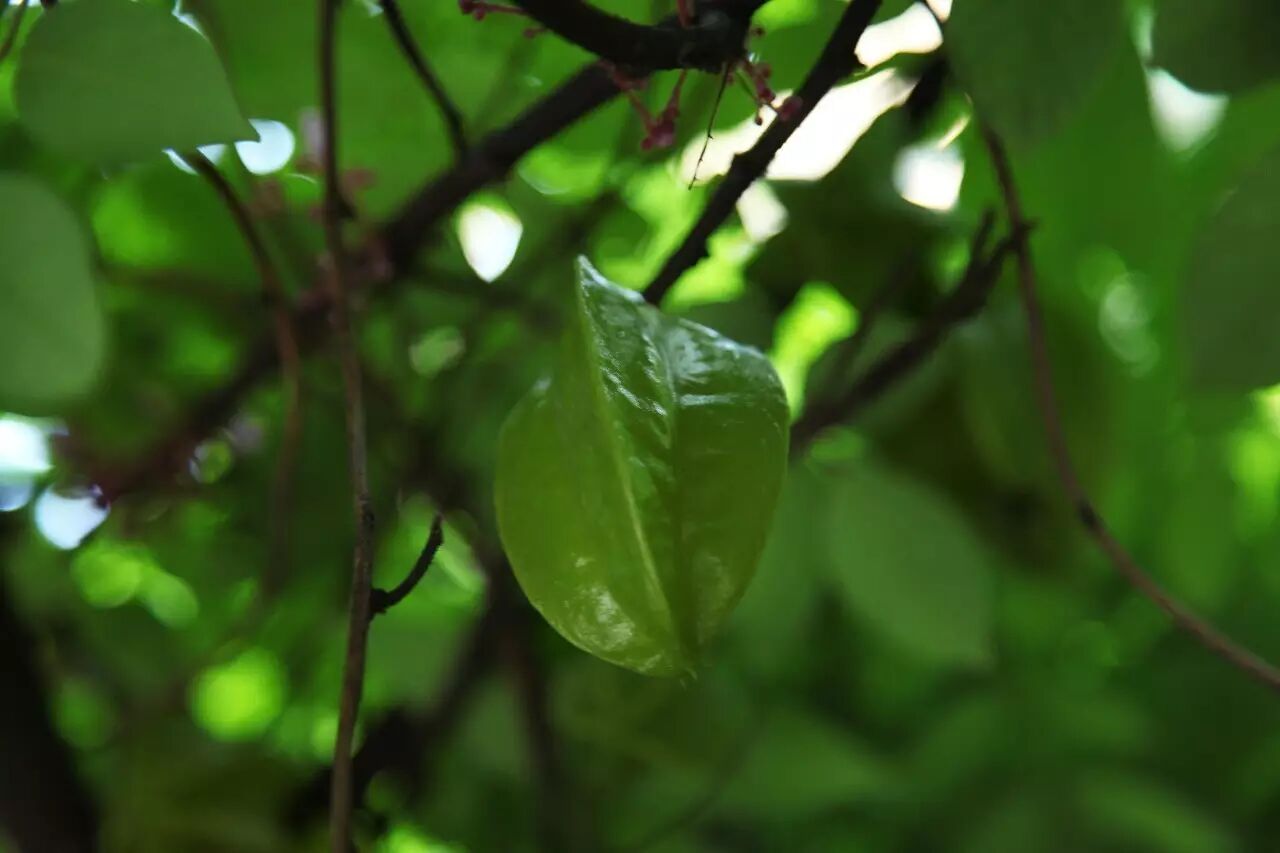 ▲一丛翠绿探出头来,树冠中藏着杨桃