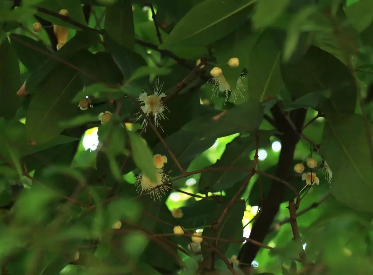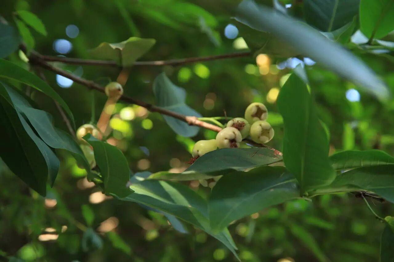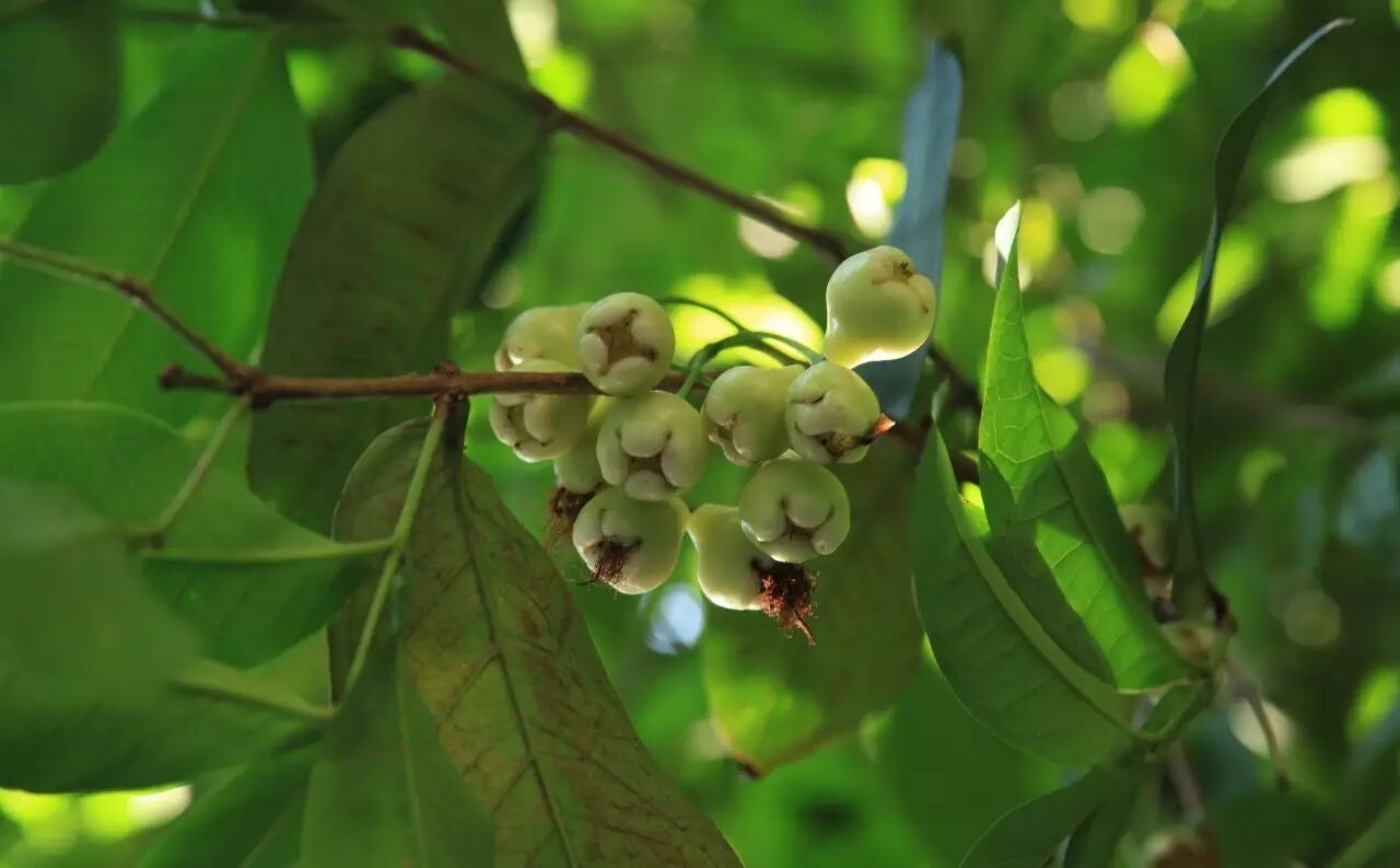 莲雾属蒲桃科,花形与蒲桃类似,皆为散开如烟花的花丝。因此在花季时,我们没能分辨出蒲桃与莲雾,直至花朵褪去,由花心的形状慢慢形成莲雾的形状才识得。譬如一个小小的佛手瓜,莹白透亮。