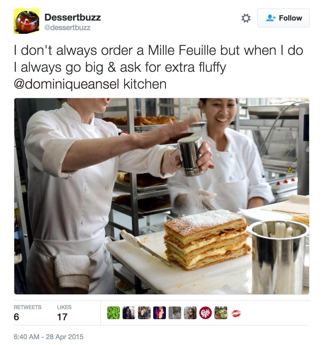 在美国掀起 “Cronut” (可颂+多纳圈合体新物种)这种神奇甜点的 Dominique Ansel ,对千层酥的要求就是要兼具层次感和薄脆,所以他对千层酥只有一个原教旨主义的要求:趁热吃!他认为人类对千层酥犯下最严重的罪行是把新鲜做好的千层酥放几个小时才吃掉。