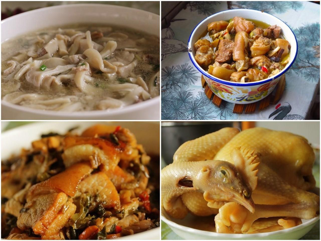 母亲做的什锦菌汤、炖猪蹄、扣肉、电饭煲焗鸡