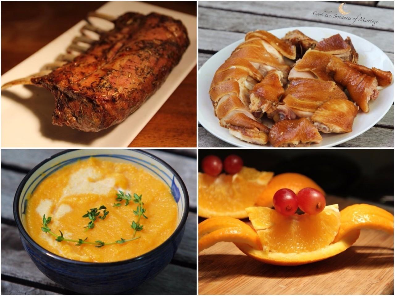 迷迭香烤小羊排、豉油鸡、奶油南瓜汤、螃蟹造型的橙子