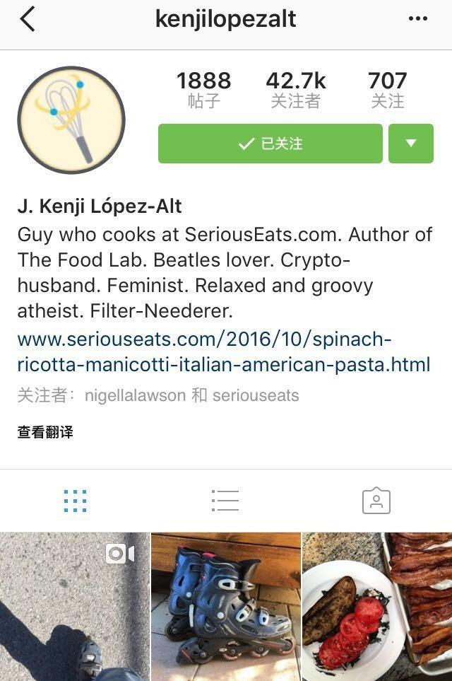 J. Kenji López-Alt是个实验派的吃货,他还是美国版下厨房Serious Eats的总监。他的第一本书The Food Lab用科学的角度来解释了家庭烹饪,登上了当时纽约时报的最佳销售磅。他在ins上会分享生活点滴和烹饪的小技巧,他出的食谱基本都发布在Serious Eats上。他的ins比较适合进阶型的肉食烹饪爱好者。