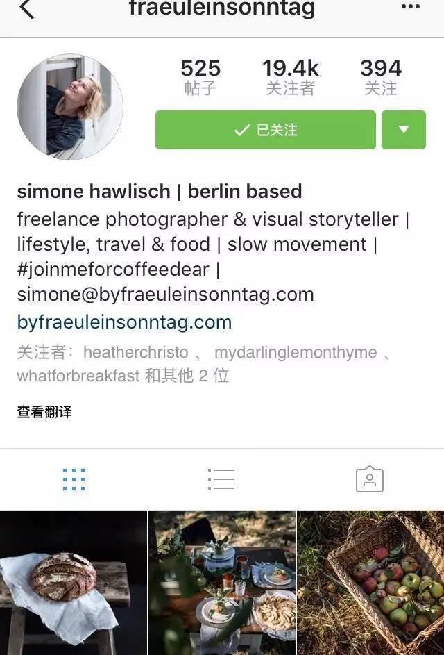 Simone是一位自由摄影师,在她的ins上分享的不仅是食物,还有她喜欢的生活的一切。她用镜头把她喜欢的记录下来,分享在ins上。在她的镜头下,时间都好像放慢了脚步,她本人比较喜欢慢节奏的生活。她记录的食物都有一种天然美味的状态,大概和她喜欢呆在大自然的环境中也有关系。每次看到她分享的照片都会觉着这个世界还是很美好很舒适的~