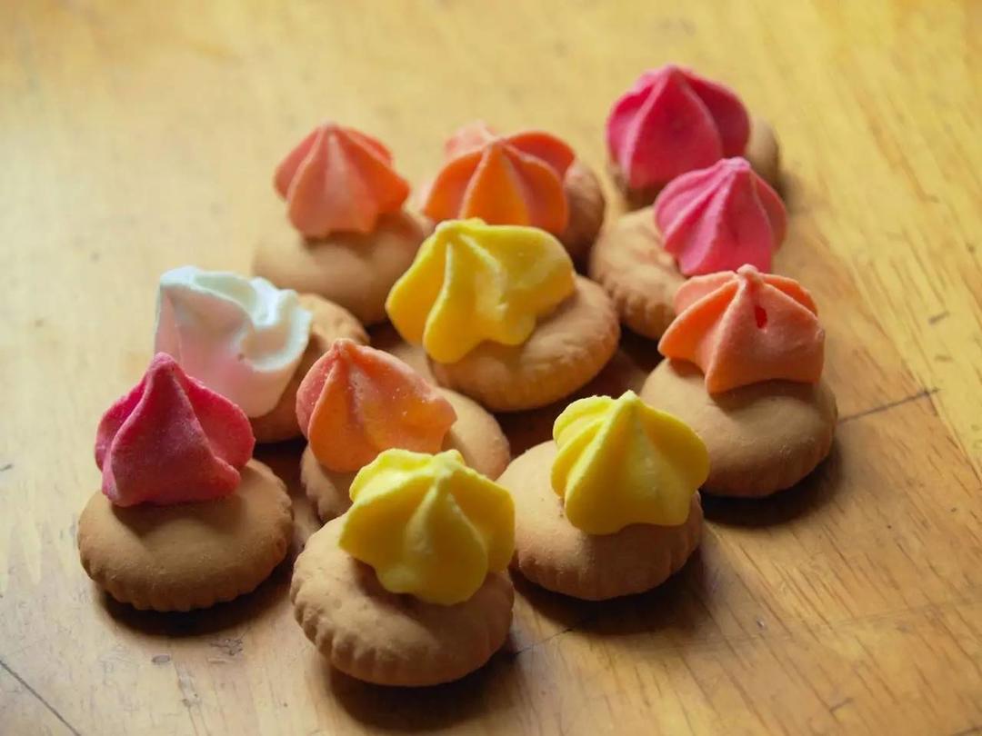 儿时花花绿绿的小饼干,上边有轻盈的糖花,你喜欢吃吗?