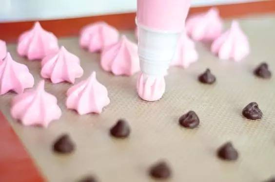 打发好的蛋白霜可以根据喜好添加可食用色素,或是各种口味的粉末,造型成任意喜爱的模样进行烘烤。