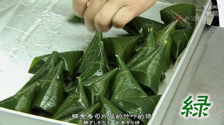 鲷鱼寿司外层的竹叶绿