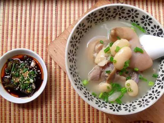 海带炖猪蹄配豆瓣酱兑的“蘸蘸”别有风味。猪蹄在火上烤烤去毛,加海带、白芸豆、姜片和葱段,不加任何调味品,文火慢炖一个上午,加少许盐即可出锅。主菜上桌后,舀两勺豆瓣酱在味碟里,滴几滴醋,可按自己自己的喜好再加其他的调味品,最后,一根细香葱洗净后切细,均匀地撒在“蘸蘸”上。