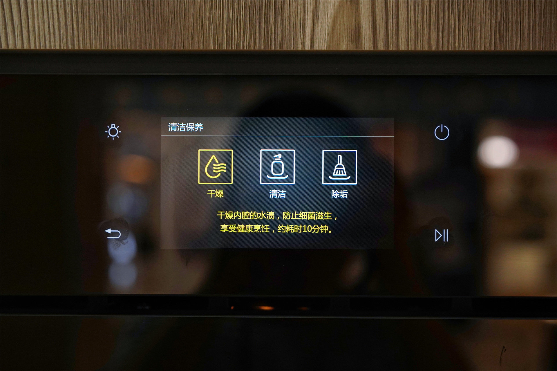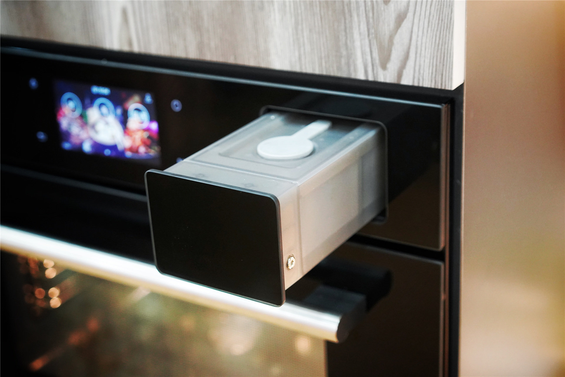 先说外观,简洁大方的外观设计,放进几乎所有装修风格的厨房都不突兀。机身表面无凸起的按键,全电子操作屏,也让机器更加时尚简约。