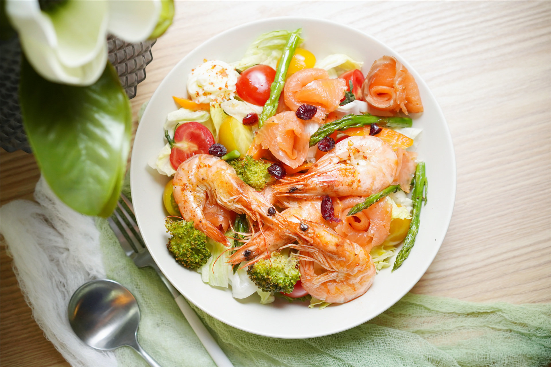 5分钟后,健康又美味的海鲜时蔬沙拉就可以装盘上桌啦!