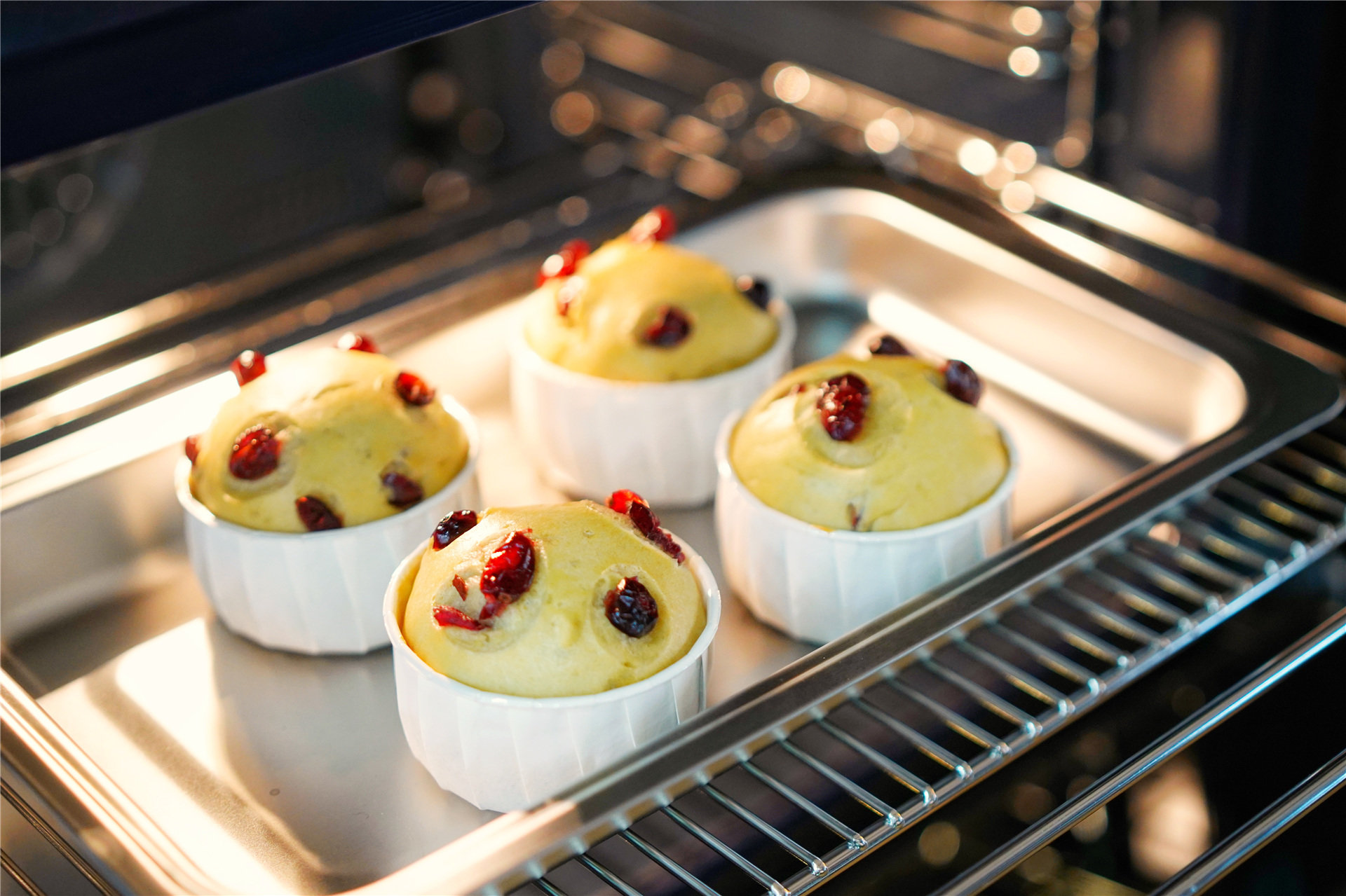 把配方做好的全麦莓果蒸糕放进蒸盘里,利用150 ℃高温蒸的功能制作,普通蒸锅蒸需要15分钟,而老板蒸烤一体机的高温蒸只需要10分钟,并且蒸汽上来的很快,不但减少蒸制时间还让蒸糕内部更加松软!在使用蒸功能时候,我有一个习惯,每次蒸汽量特别大,所以会从侧面打开一个小口,等蒸汽散开之后再把门打开,这样就避免了蒸汽雾脸了。