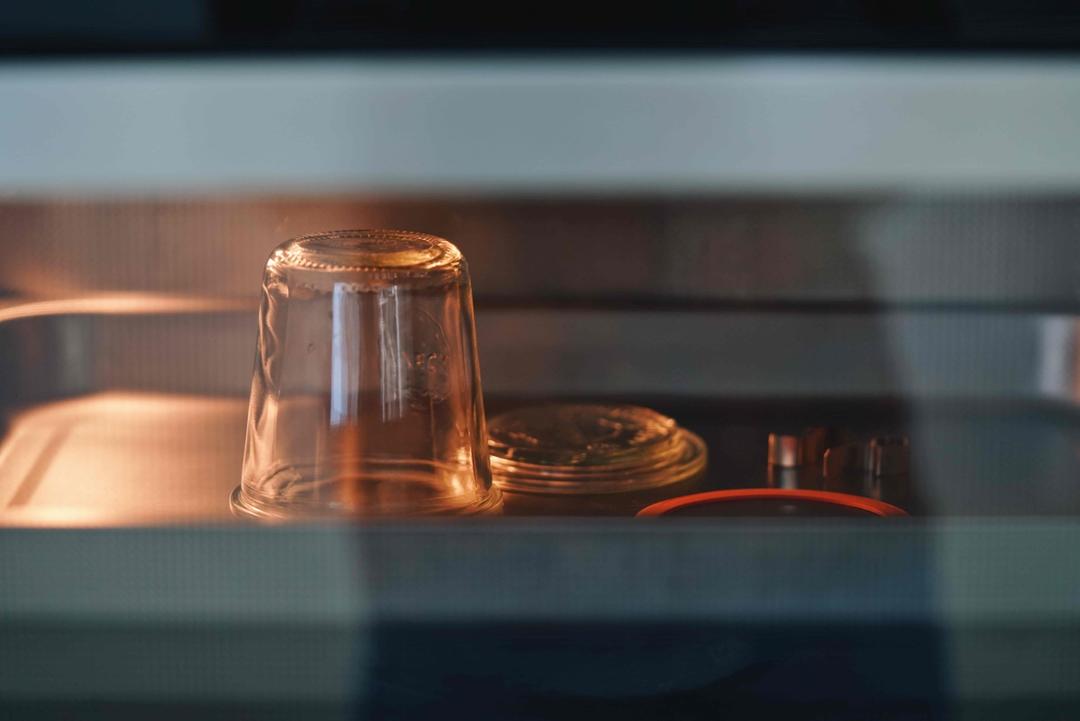 做酸奶之前要挑选和处理容器,容器要选用密闭的,无油无水,在加入原料之前还要进行消毒杀菌,后续的发酵和保存才更方便。瓶身倒扣在无孔整盘上,和其他配件一起送入蒸箱,选择【杀菌】模式,处理10分钟。