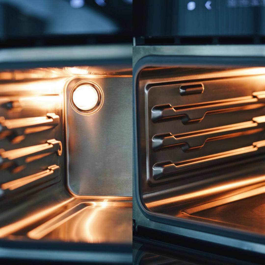 无需安装层架,内部腔体一体成型,无死角清洁打理都非常容易;可视化窗口加上内置灯,明亮不刺眼,食物烹饪状态也能一览无余,暖黄色灯光下的食物会散发着blingbling的诱人光芒。