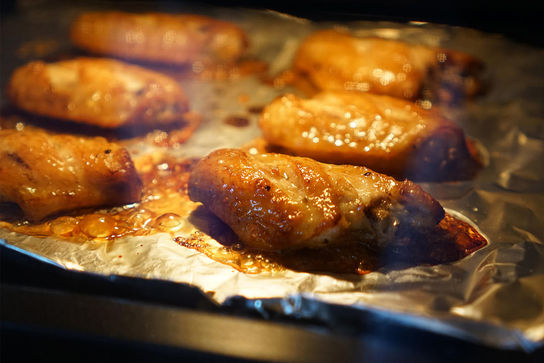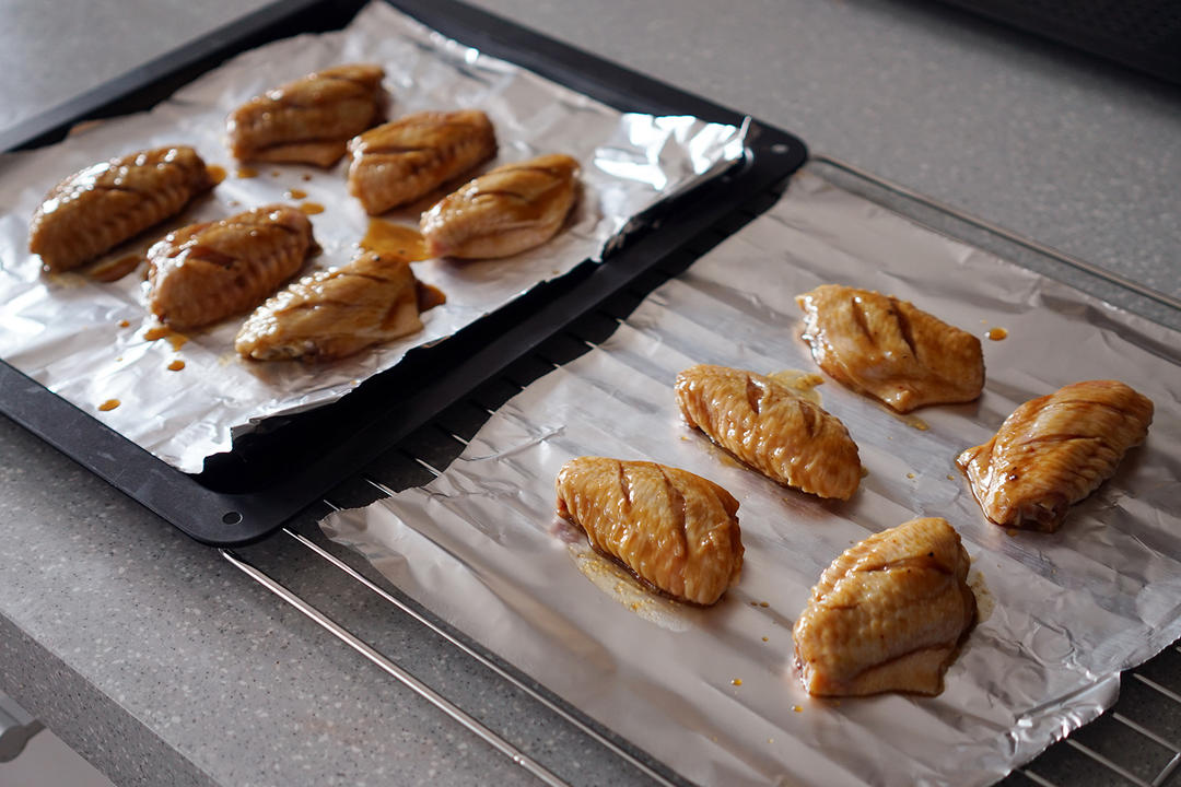 铺锡纸,分别放在烤盘和蒸烤架上。先试蒸烤模式下的,再试纯烤的。平时烤鸡翅也是很多了,蒸烤的鸡翅还是头一次尝试。依然使用自动菜单,so easy。