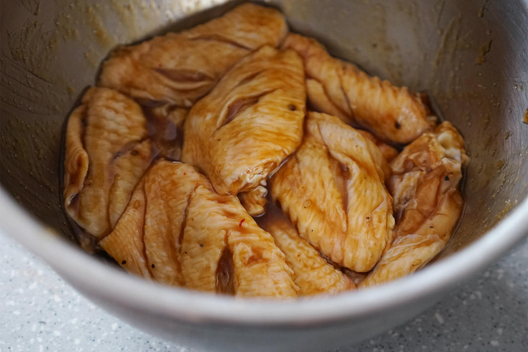 鸡翅正反都斜切两刀。用料酒,蚝油,生抽,照烧汁,黑胡椒碎一起腌渍入味。