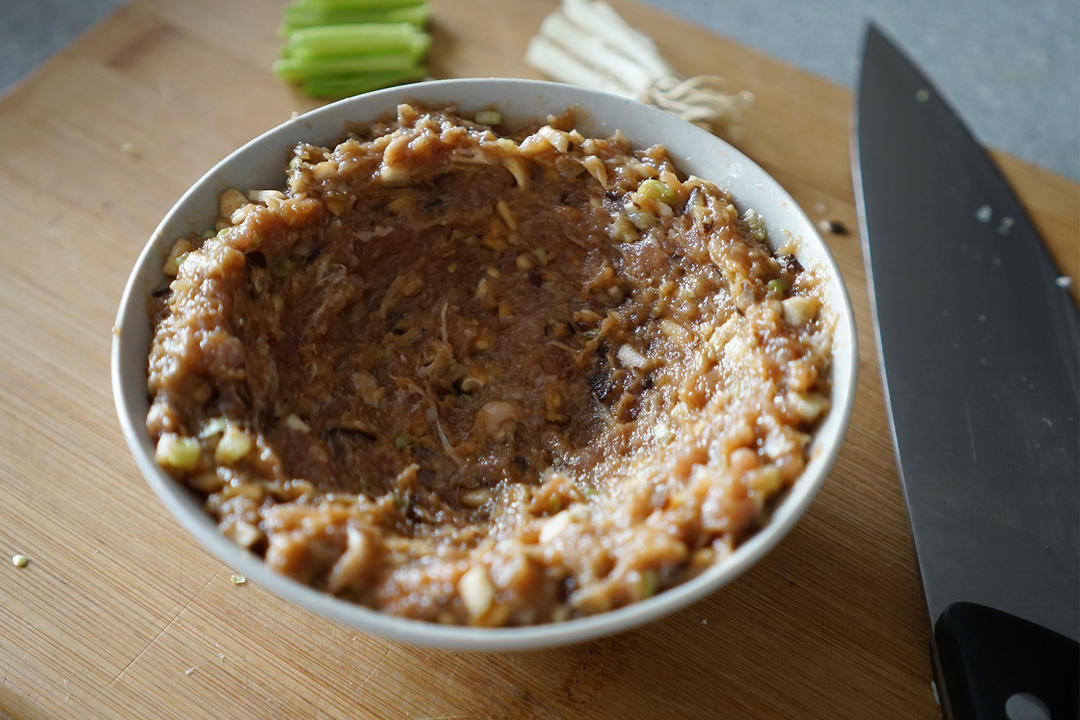 一个香菇切碎,100克肉馅,加蛋清,小葱,生抽,老抽,蚝油,淀粉,姜汁,少量糖调味,顺着一个方向搅打上劲,并摔打几次。