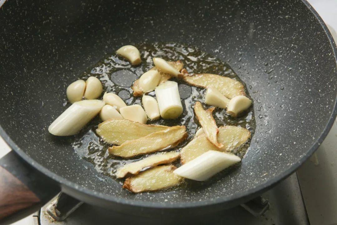 4| 锅中放入黑麻油,开小火,放入姜片,煸炒到香气四溢,稍干,边缘稍金黄;加入蒜瓣和葱段翻炒,如果喜欢辣味,也可以加一些干辣椒一起翻炒。