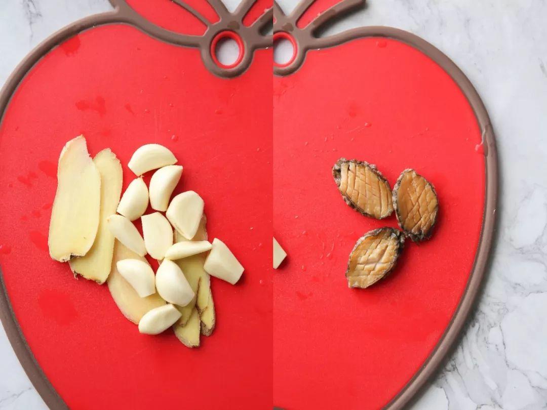2| 大蒜轻拍,姜切大片,鲍鱼切花刀备用。