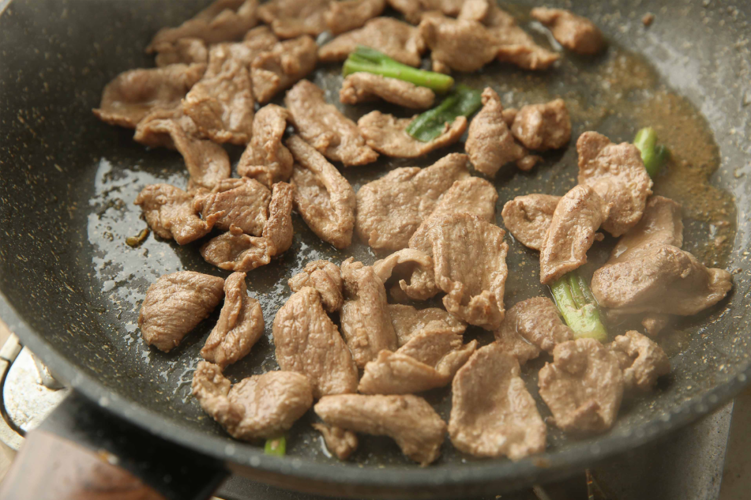 4|锅中放油,油热后加入腌制好的鸭胸肉,中火快速翻炒至鸭胸肉熟透、香气四溢即可盛出。