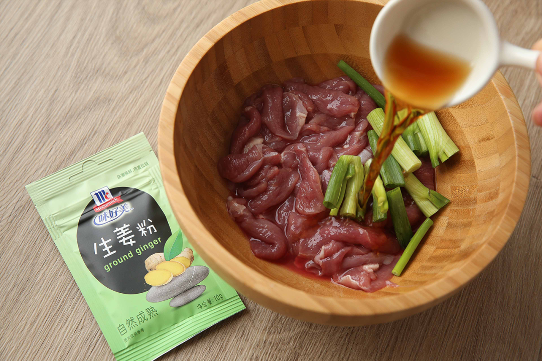 2|把鸭胸洗净并切成薄片,然后加入料酒、一半葱段、一半姜片拌匀冷藏腌15分钟以上。也可以用「味好美生姜粉」代替姜片,去腥提鲜美味不打折。