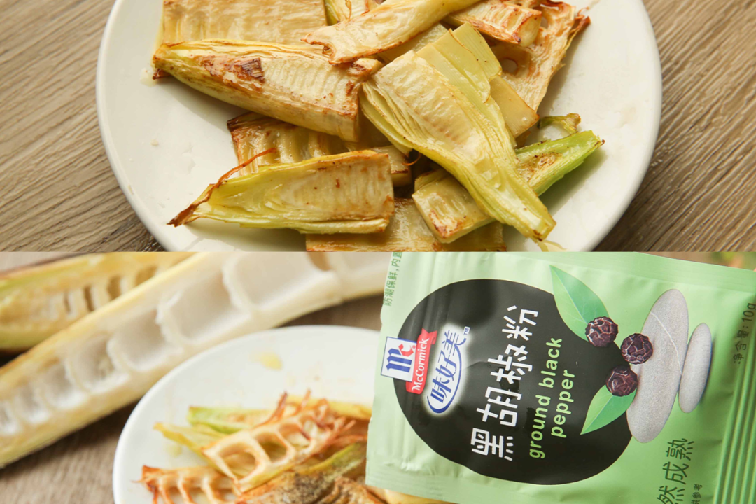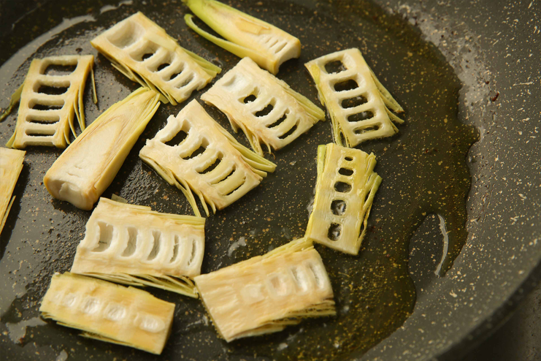 5|另起干净的锅,放入食用油,小火把嫩笋尖煎到金黄备用。锅中余下的油,可以放入剩下的稍微老一些的笋片,翻炒到断生。