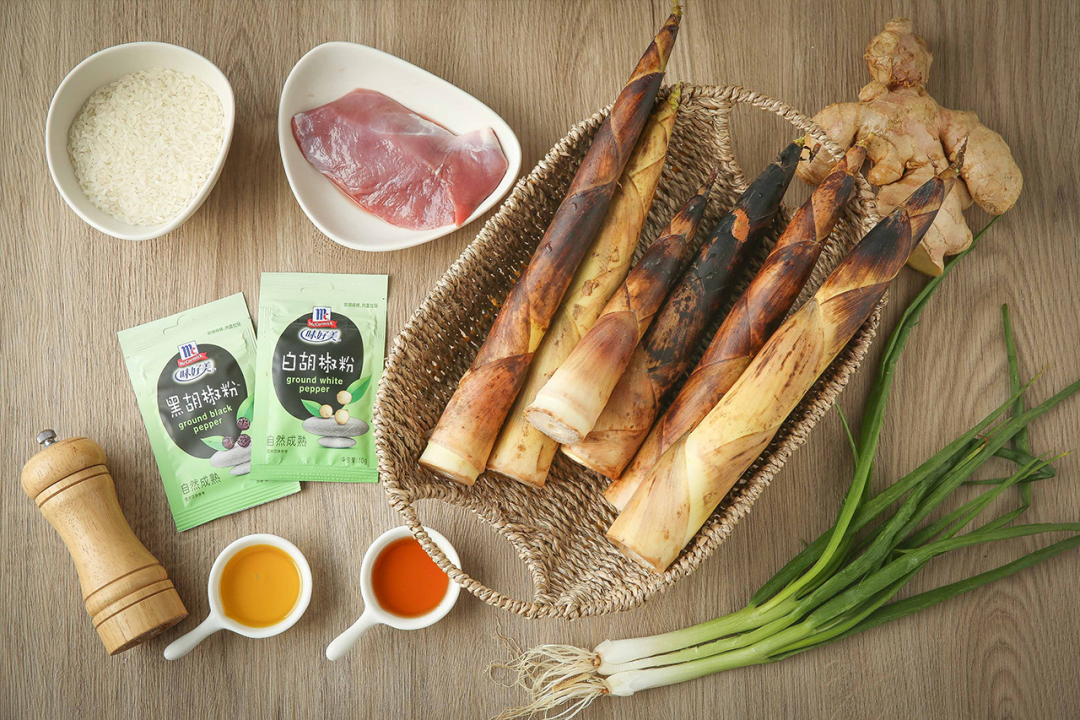 1|准备好所有的食材。主食材是鲜美脆嫩的春笋和嫩滑的鸭胸。做鸭肉粥少不了用白胡椒来去腥提鲜,用的是味好美这款小包装的白胡椒~