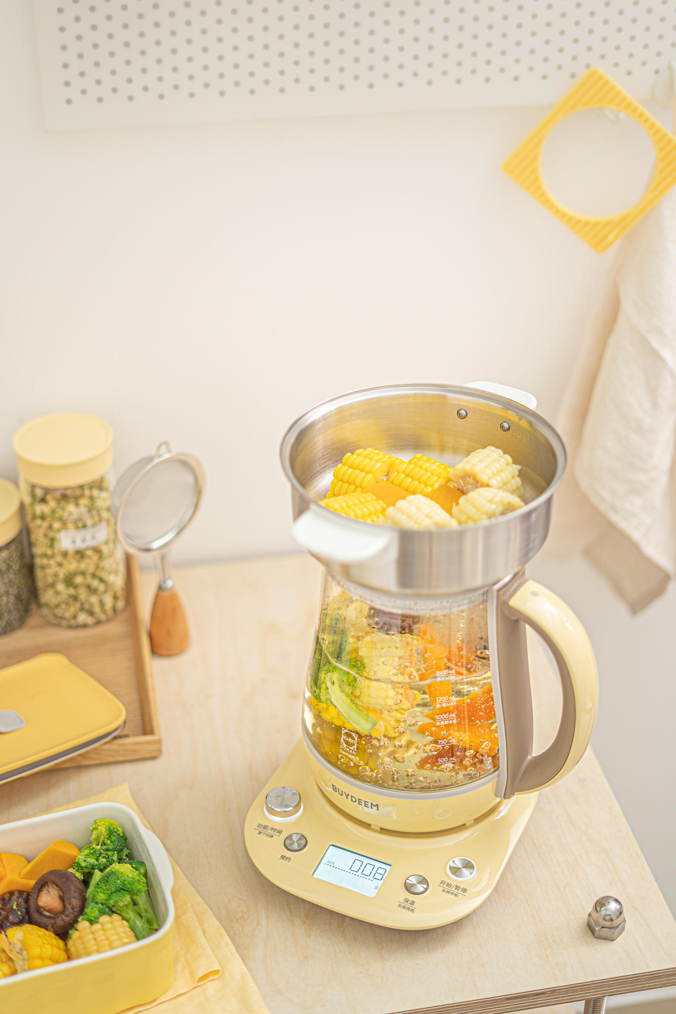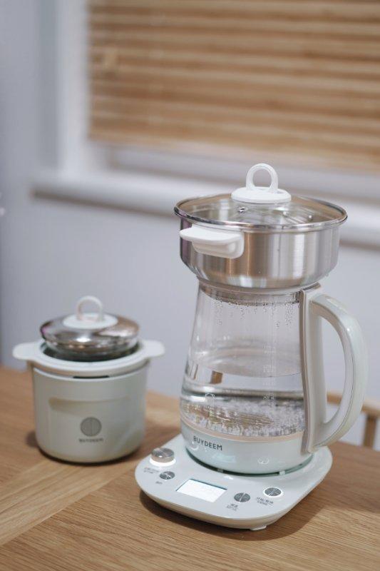 虽然和K165相比,K159T缺少预约功能,没了调时调温这种个性化定制,但它完全能够满足日常需求,配齐蒸笼、炖盅配件之后,可蒸可炖可煮,一壶多用~