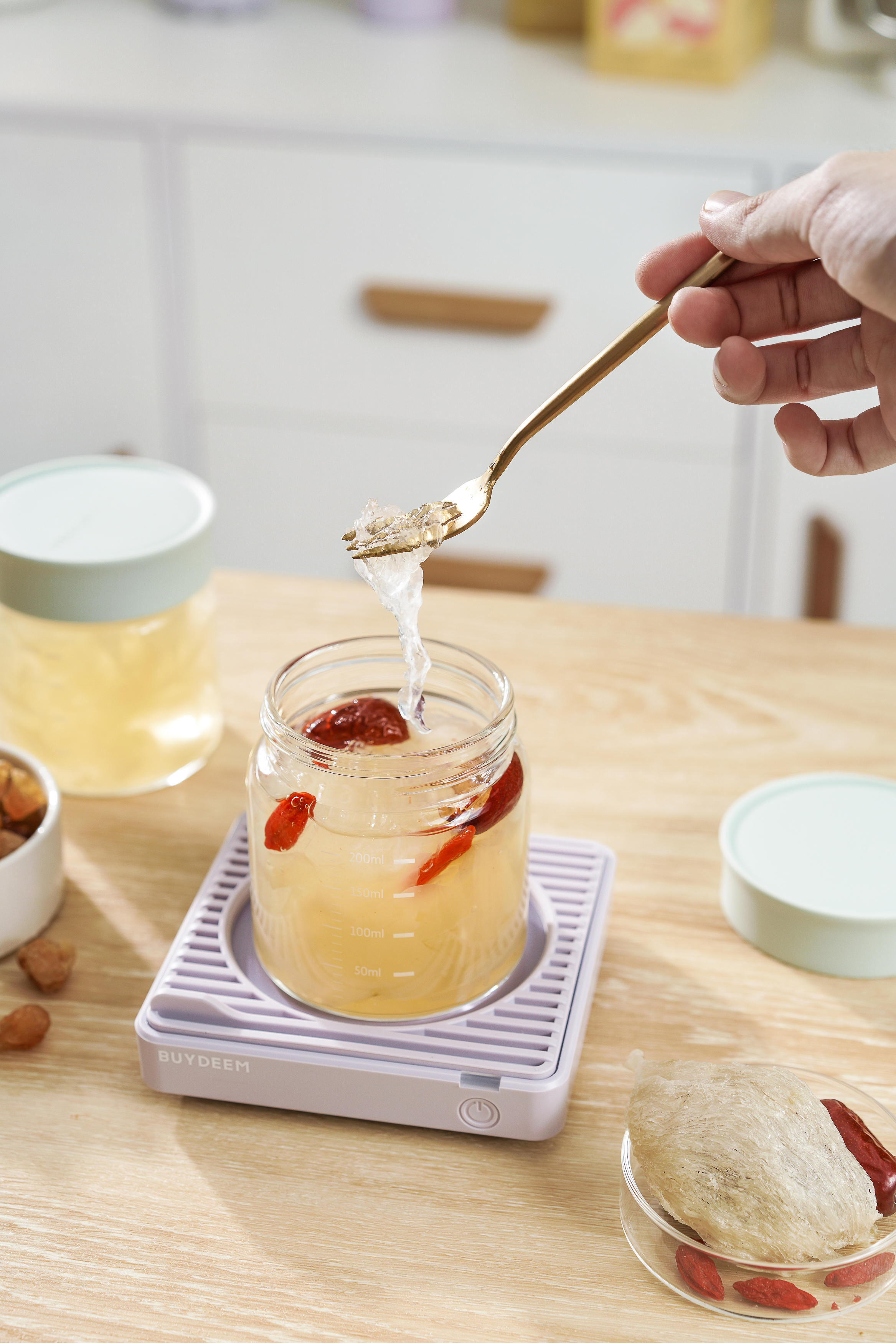 煮好的燕窝分装起来放冰箱,想吃的时候拿出一瓶放在保温杯垫上加热,养颜也要暖暖的~