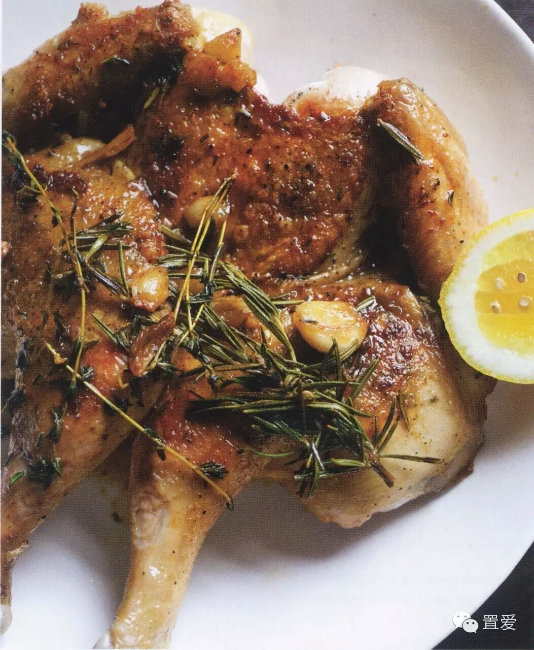 ❼ 蒜香酱汁:平底锅放入大蒜、迷迭香和柠檬汁,然后高温加热(扔进几个红辣碎让它有一点辣味)。刮下锅底鸡肉的焦块,舀一勺碟子里的鸡汤进平底锅,煎3 分钟。然后把酱汁淋在刚刚做好的鸡肉上食用。