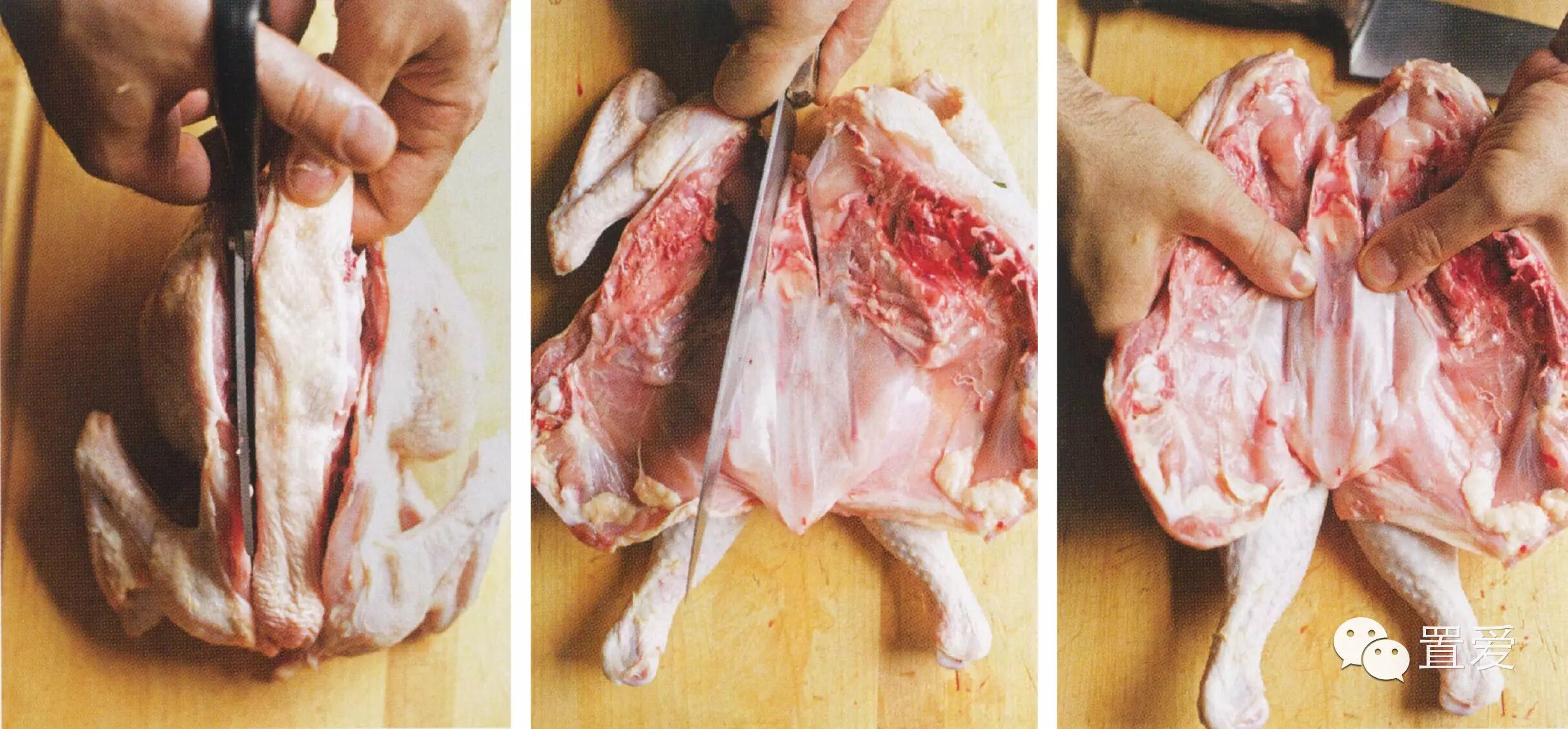❸ 把鸡洗净,再用厨房用纸拍干。鸡胸一面朝下,放在菜板上,让脖子根处朝向自己。撑开脖子,修剪所有额外的皮和脂肪。顺着脊椎的左右两边,从头到尾切下,以除去脊椎。