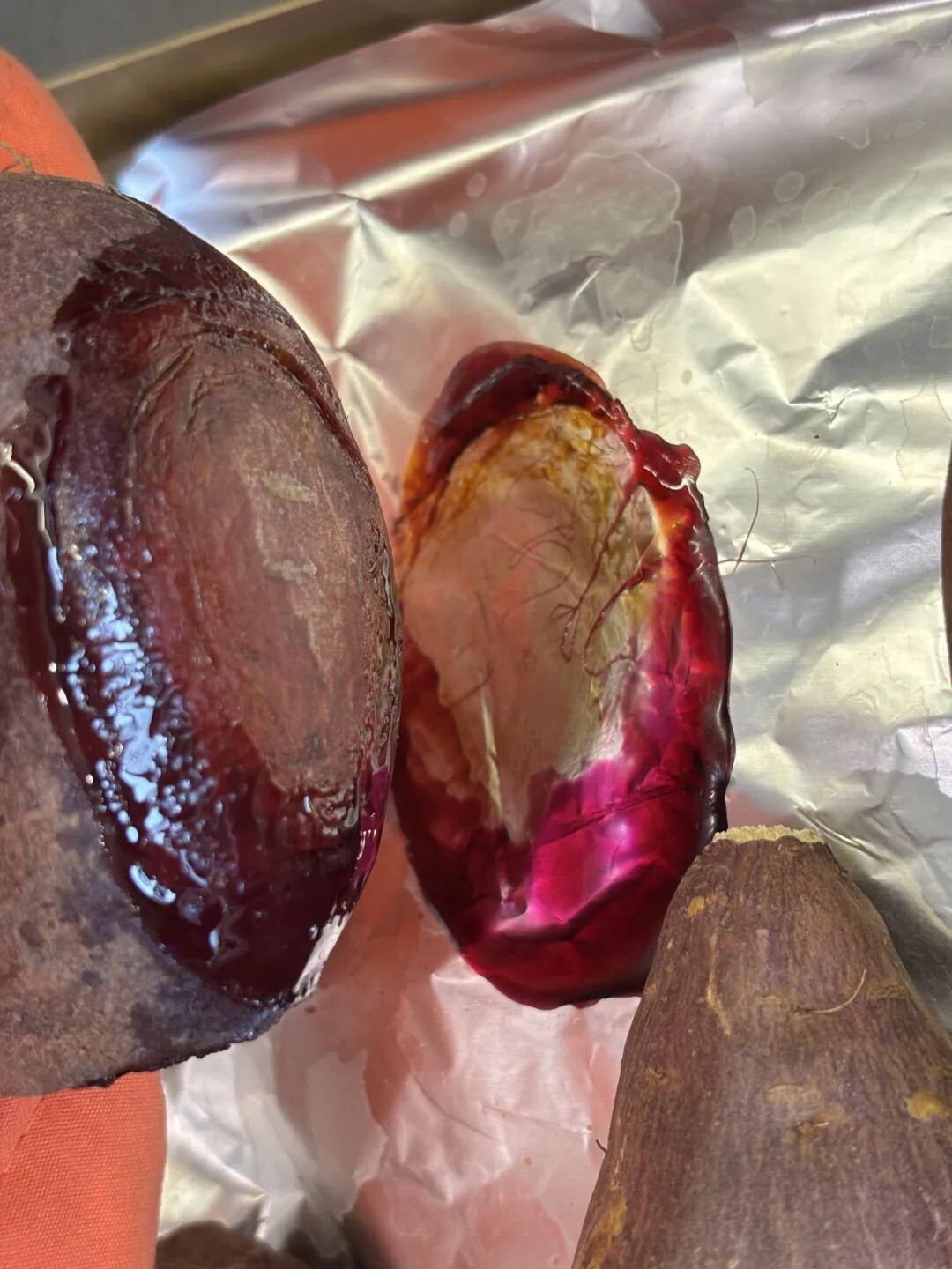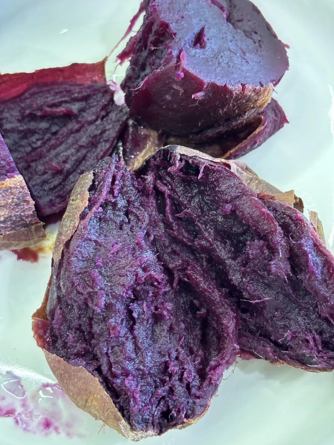 它彻底打破了普通紫薯“干粉噎人” 的刻板印象,尤其是烤过之后,薯芯变得像冰淇淋一样绵密,用勺子挖一勺,能看到细腻的质地里带着淡淡的光泽。