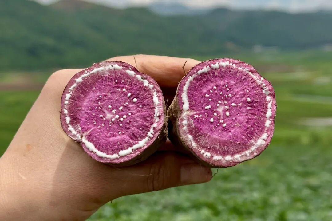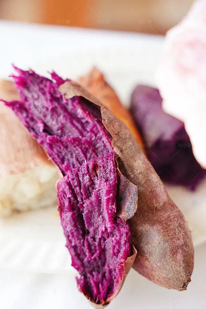紫黑色的外皮裹着饱满的薯身,轻轻剥开一点皮,就能看到内里深紫色的薯芯,像藏了一颗软糯的“紫宝石”。