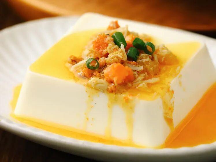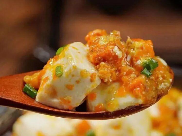 嫩豆腐焯好水码在盘子里,锅里加点水,放三勺蟹黄酱烧开,往上一淋。